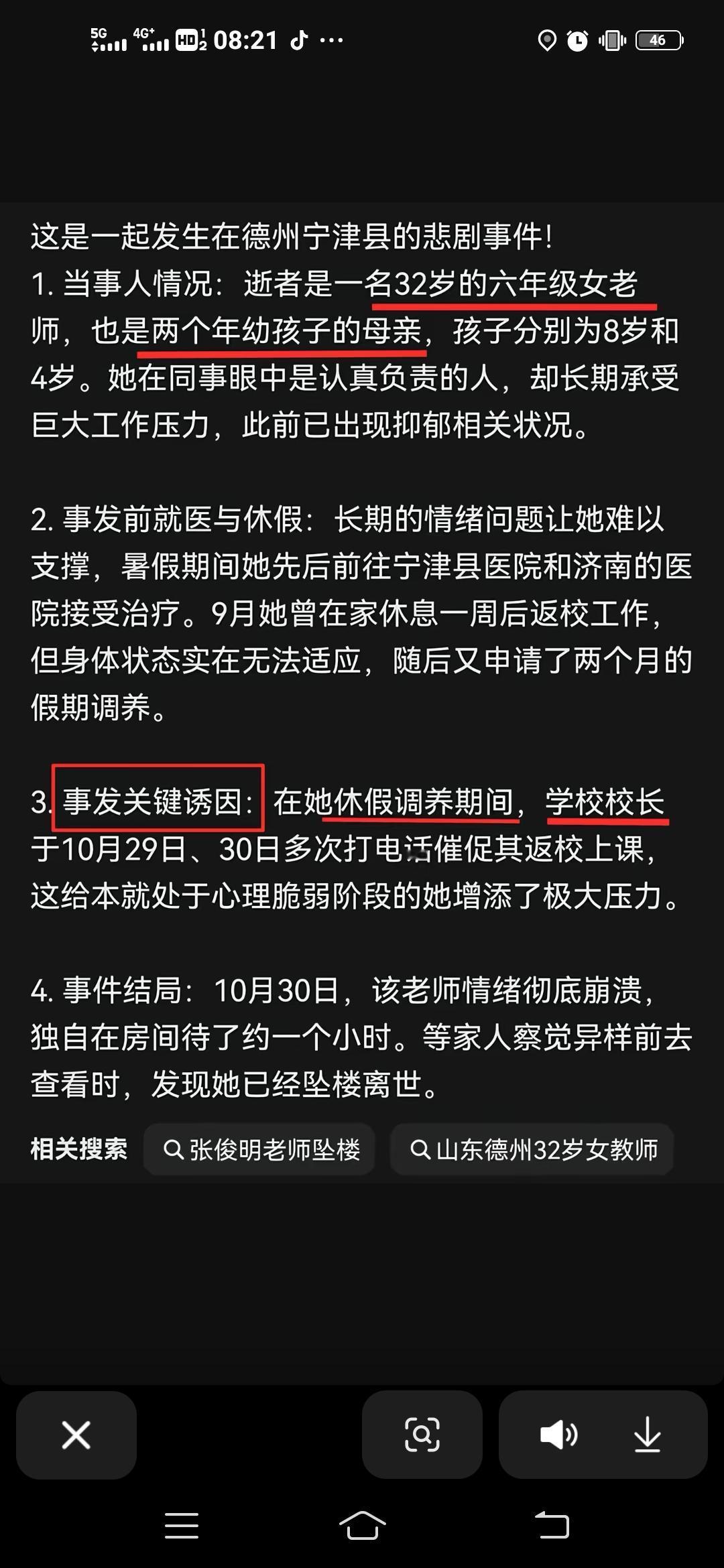 32岁的六年级女老师崩溃自杀,也是两个年幼孩子的母亲,孩子分别为8岁和4岁 她在同事眼中是认真负责的人,却长期承受巨大工作压力,此前已出现抑郁相关状况。为啥不辞职呢,都已经这样了,是责任心太重了吗?当时跳楼的时候很多人围观,有人传小孩,也有人传是老师,没想到这位老师背后经历太多了。当时还想不通为什么会选择这条路,原来是重度抑郁,自己都没有恢复好 太内耗了,哎,学生跳完老师跳 教育出问题了,有压力也不能走这么极端啊,此处不留爷自有留爷处,如果老师压力大,让你当官的话,估计更干不了