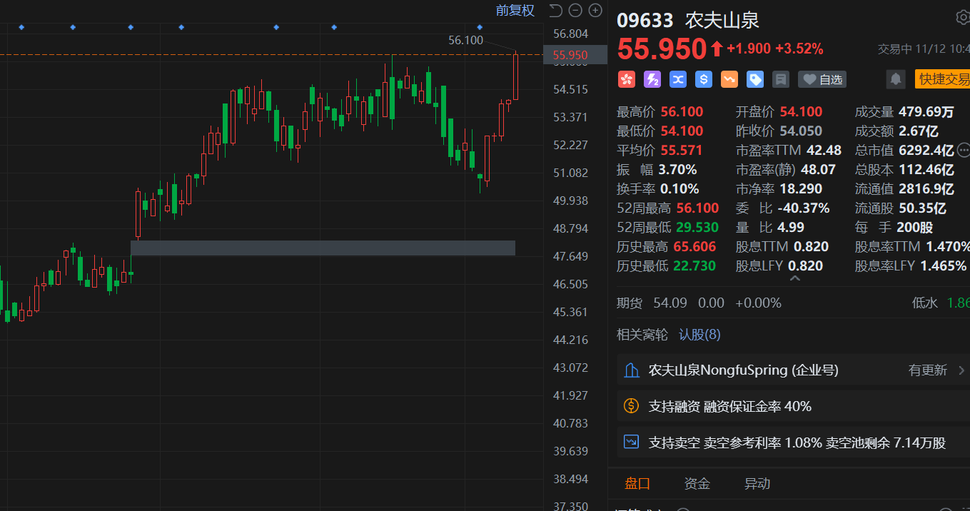 农夫山泉(9633.HK)延续涨势,现涨3.5%报56.1港元,刷新近期阶段新高,近5日累计涨超10%走出反转行情,市值6282亿港元。