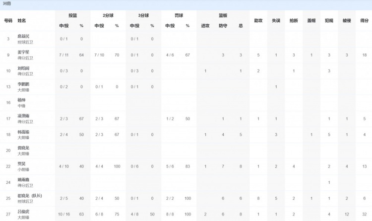 河南队方面,吕俊虎32分8篮板1助攻,姜宇星18分3篮板5助攻。