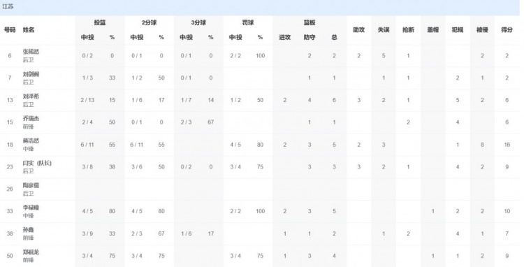 江苏队方面,蒋浩然16分5篮板2助攻,李禄曈10分5篮板。