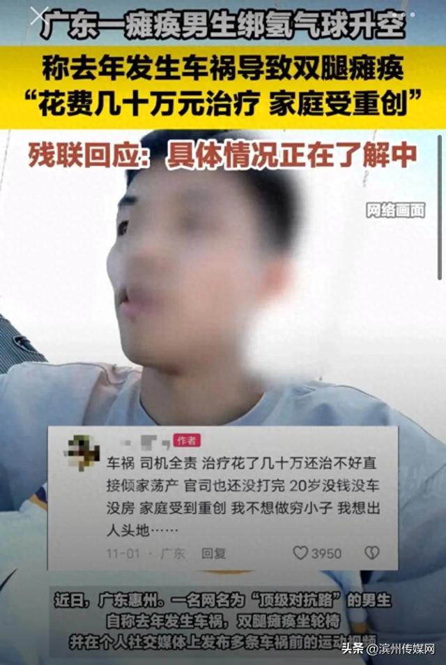 20岁瘫痪小伙绑氢气球将自己升入百米高空,降落时剪断绳子摔落,自称“车祸瘫痪花费几十万元,家庭受重创”