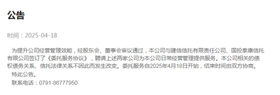 2025年4月18日,中航信托在官网发布一则简短公告,宣布与建信信托有限责任公司、国投泰康信托有限公司签订《委托服务协议》,聘请这两家公司为日常经营管理提供服务。