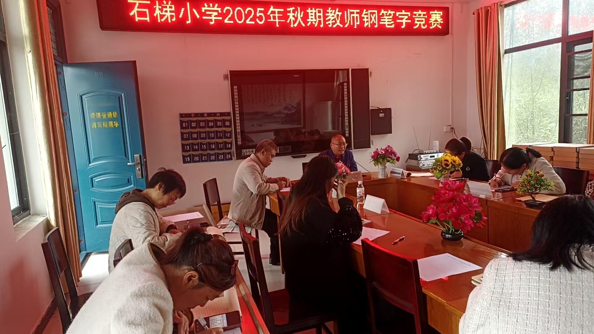 2025年11月11日上午课间操时间,西峡县回车镇石梯小学“2025年秋期教师钢笔字竞赛”在学校会议室拉开帷幕,全体教师齐聚一堂,以笔抒怀,尽显书写魅力。