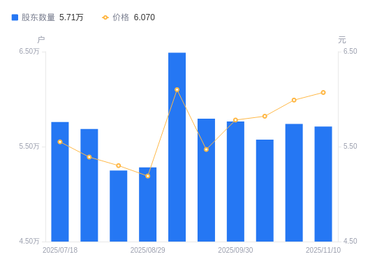 日期A股户数(户)流通A股户均持股数(股)户均持股市值(万元)2025-11-105711710210.816.202025-10-205739010162.246.092025-10-105573710463.626.092025-09-305765610115.355.852025-09-195794310065.255.512025-09-10648898987.825.482025-08-295281311042.945.732025-08-205248411112.165.892025-08-085686310256.425.532025-07-185759310126.425.62
