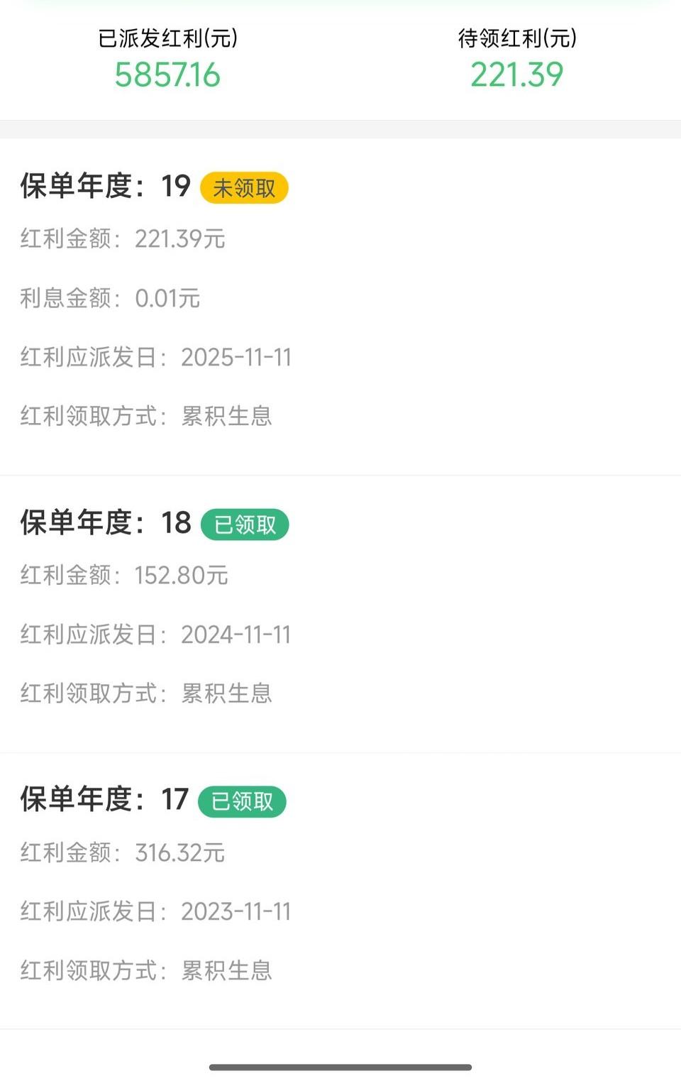 叮咚,221.39元的红利到账。 早上收到了一条保险公司发给我的短信提示,我今年的红利到账了。 我下载了这个保险公司的APP,通过密码登录进去查看,从2015年开始到今天,我已经提现5800多了。 我的这份保险是我父亲在世的时候给我买的,他当时经不起保险员的软磨硬泡,他交了五年,我交了五年,十年交了26500。 从2015年起开始分红,有的时候200多块,最多的是300块,最低的时候是几十块钱,累积到现在已经拿了近6000元。 这份保险,合同终止到2053年,那时我81岁,按照今天的红利来计算,还有28年时间,我还可以拿大概6600元。 我有个疑问,我的合同只要交17000就可以了,为什么我交了26500,那余下的钱去了哪里? 现在的红利6000,+未来28年的预计红利6000,我只能拿回来12000,那离26500还差不少呢? 我不懂这保险套路,反正,目前有红利就好。