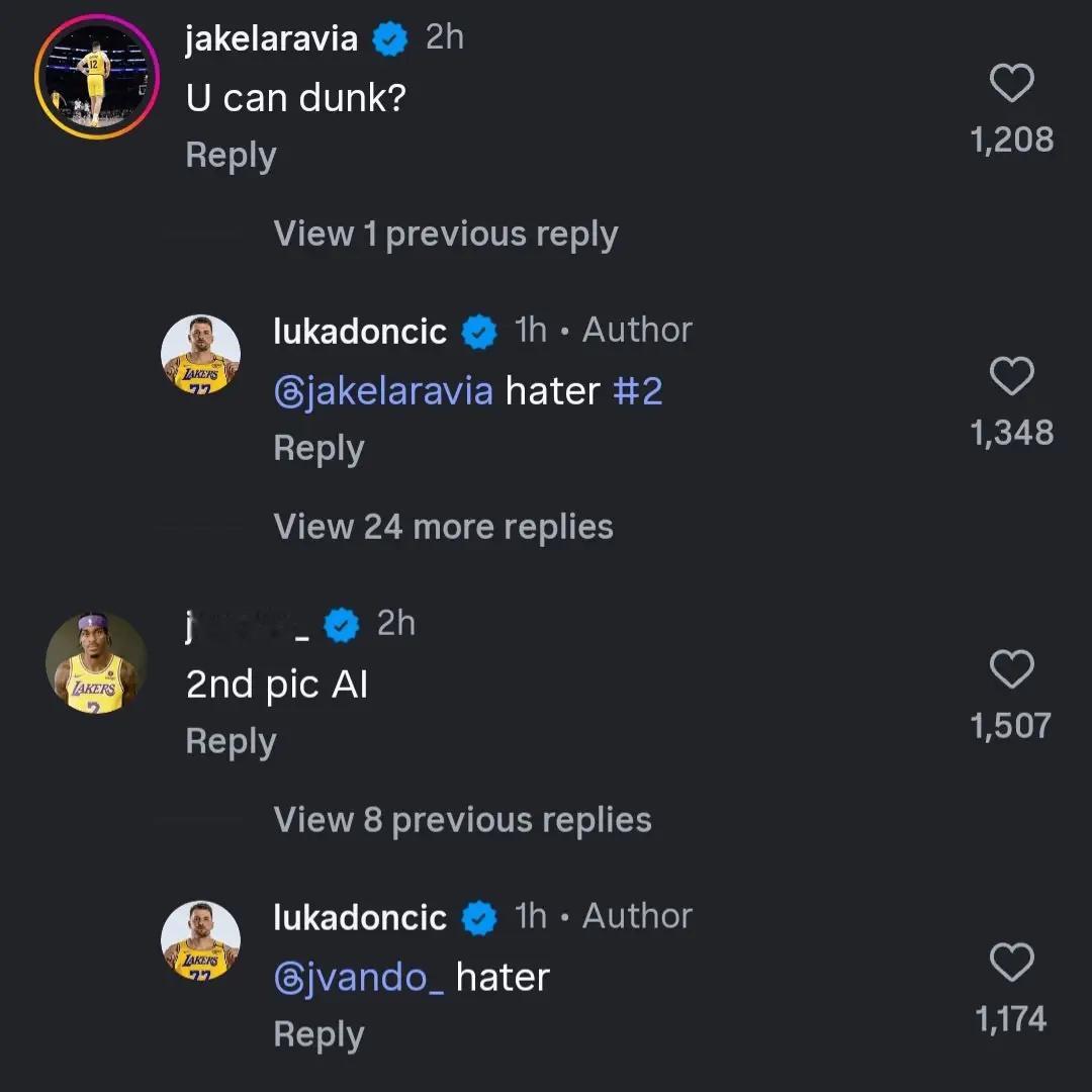 东契奇赛后在社媒晒出扣篮照!范德比尔特评论区回复:“扣篮照是AI做的。”东契奇回复:“小黑子。”拉拉维亚评论区回复:“你能扣篮?”东契奇回复:“小黑子2号。”