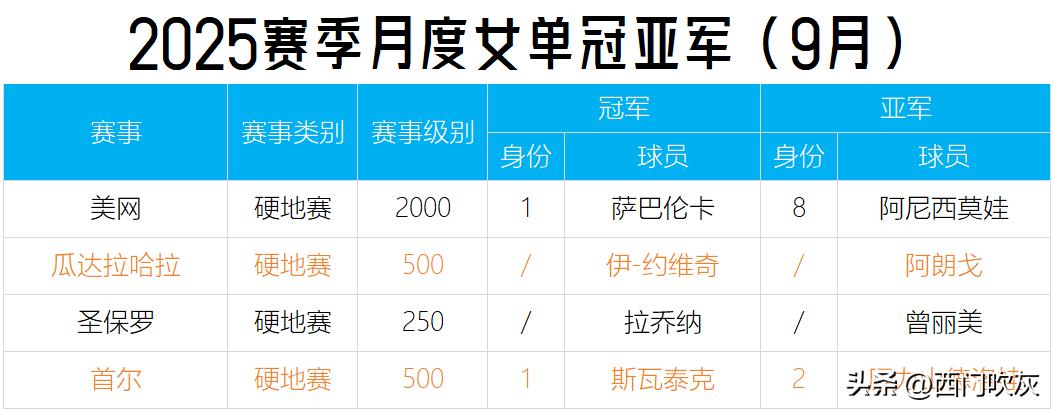【三进大满贯决赛终夺冠!9月最佳当属萨巴伦卡!】 本赛季美网和温网女单实在是太具有戏剧性! 温网女单半决赛,萨巴伦卡被阿尼西莫娃淘汰,女单决赛,阿尼西莫娃完败给了斯瓦泰克斩获亚军。 到了美网,女单1/4决赛,阿尼西莫娃横扫斯瓦泰克实现了复仇;女单决赛,萨巴伦卡击败阿尼西莫娃夺冠,同样实现了复仇。