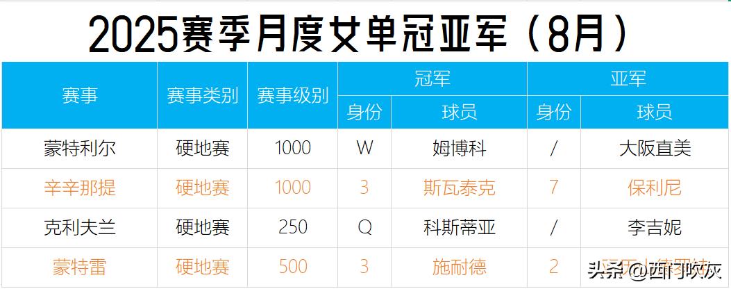 【姆博科与斯瓦泰克分享八月最佳!一月双千赛姆博科一鸣惊人!】 如果把美网放在8月,那8月会显得很拥挤,两场1000赛打头,没必要再加大满贯。 值得一提的是王欣瑜在克利夫兰站杀进了半决赛,一直到美网前其实状态还不错。