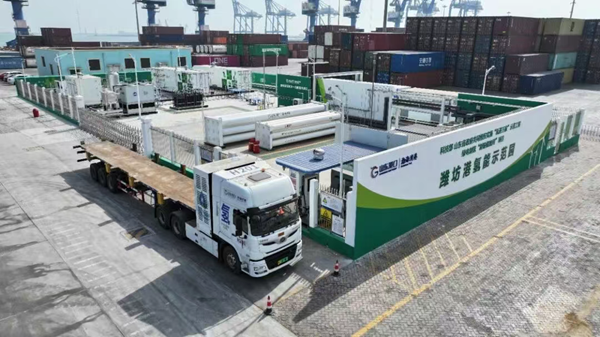 山东省港口集团聚焦绿电全场景深度应用,推动从被动消纳向循环增值转型。在渤海湾港制氢站,依托港区4台6.7MW风电,建成了500kg/12h加氢站、200Nm³/h电解水制氢站和9m³储氢瓶组(可储备300kg压缩氢气),年产绿氢90吨,能满足港区10辆氢燃料电池重卡的每日用氢需求。