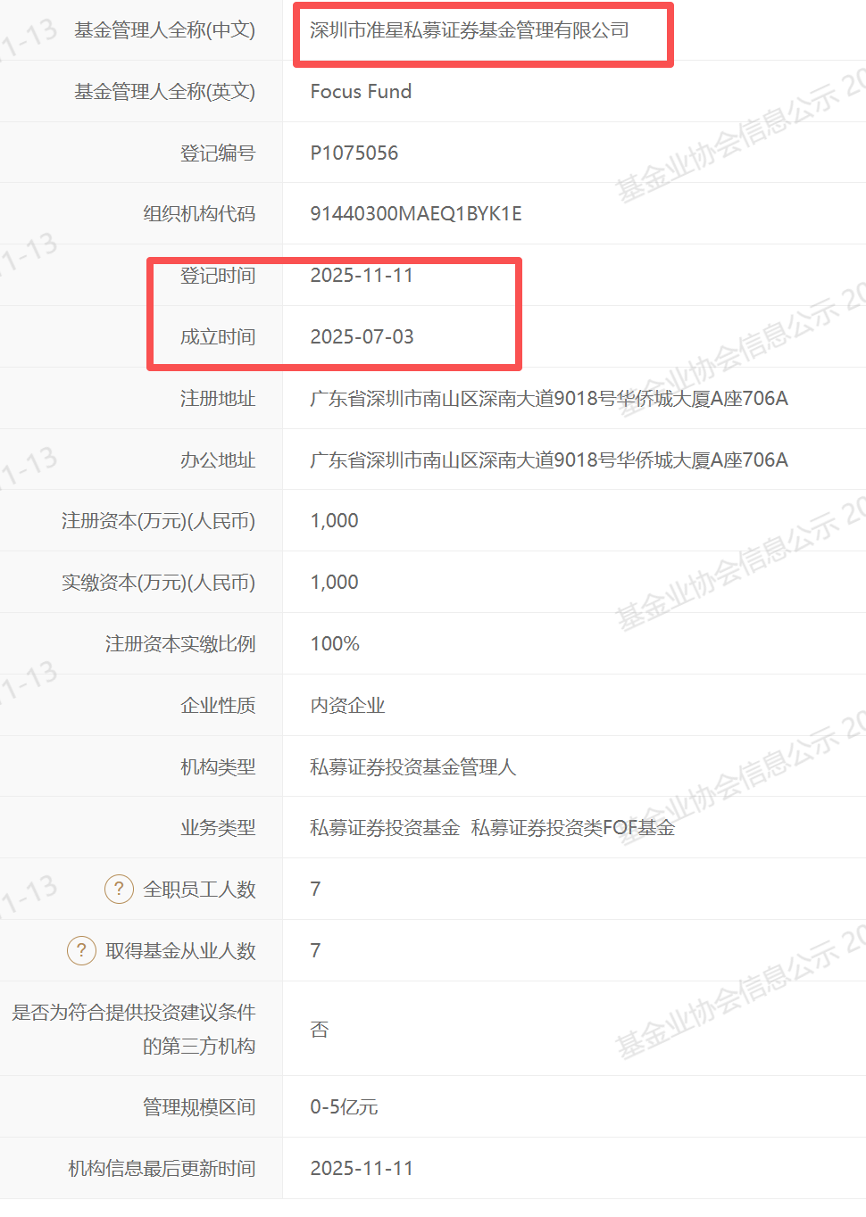 准星私募早在今年7月3日就已经成立,实缴资本1000万元。公司现有7名全职员工,注册地和办公地都在深圳南山区。看来这位曾经的“量化腹肌男”,这次是真准备在私募圈大干一场了!