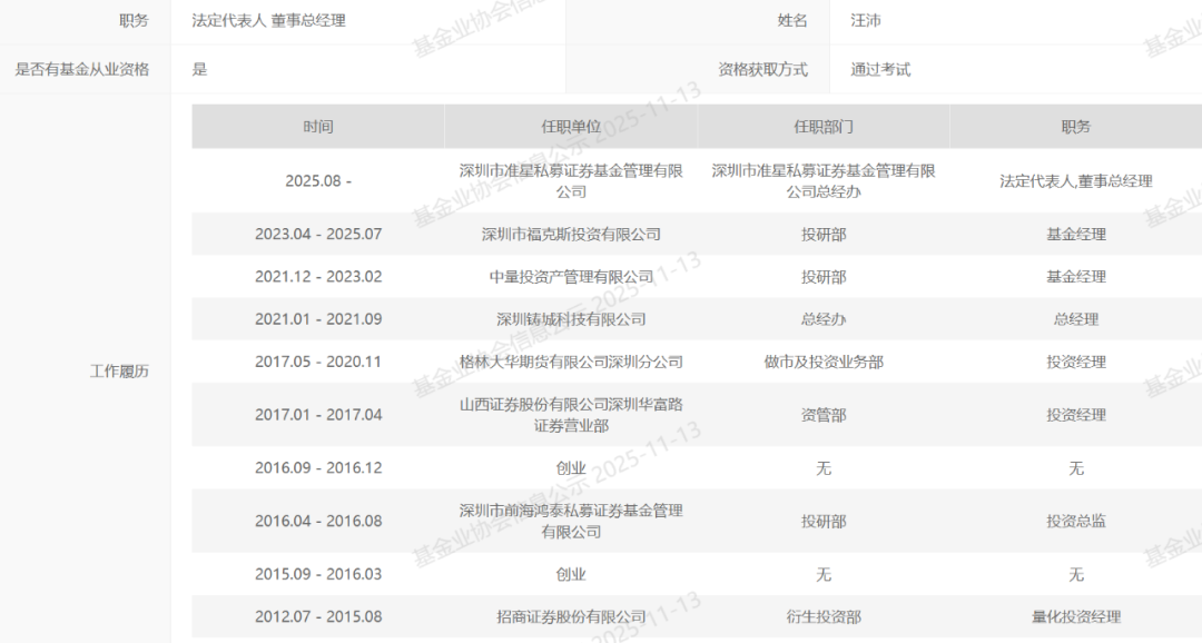 最近,汪沛又有大动作。中基协最新信息显示,由汪沛掌舵的深圳市准星私募证券基金管理有限公司,在11月11日“光棍节”这天正式完成备案,成为11月首家拿到“入场券”的证投类私募管理人。