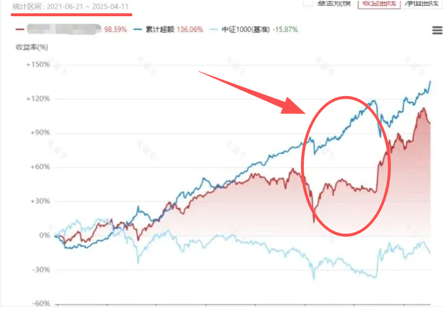 当然,对基金经理来说,再多的故事、再强的团队,都不如一张漂亮的业绩单有说服力。从朝阳永续提供的一张汪沛净值修复能力图显示,今年春节前小微盘崩塌,汪沛掌管的1000指增代表产品,经历了回撤后节后就迅速修复;到了4月份,贸易战引发市场深度调整,该产品回撤控制优秀。自2021年6月成立,其累计收益达到了98.59%。这波“抗压+反弹”操作,着实漂亮。