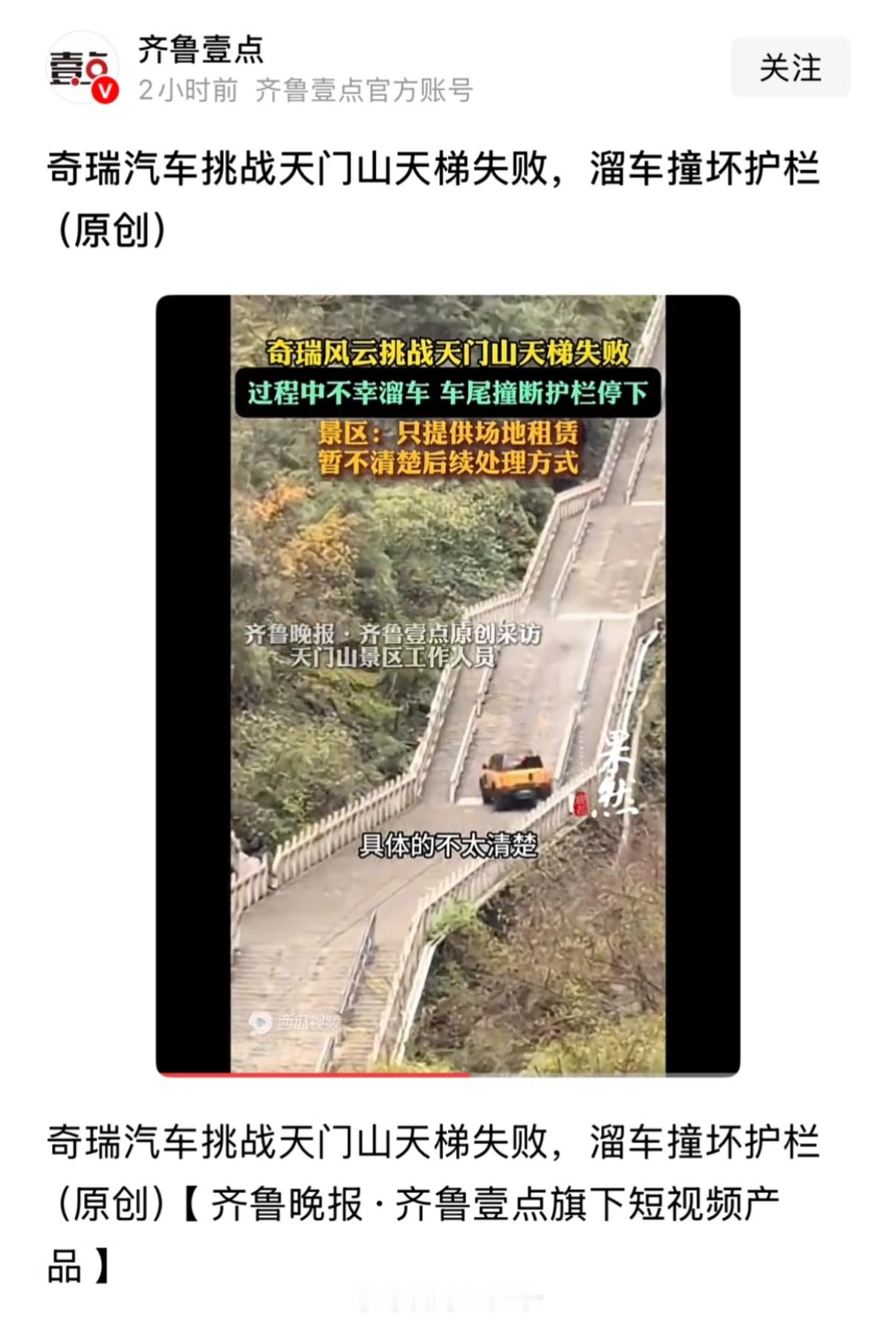11月12日,奇瑞风云X3L挑战天门山天梯失败的视频广泛流传。视频中,风云X3L