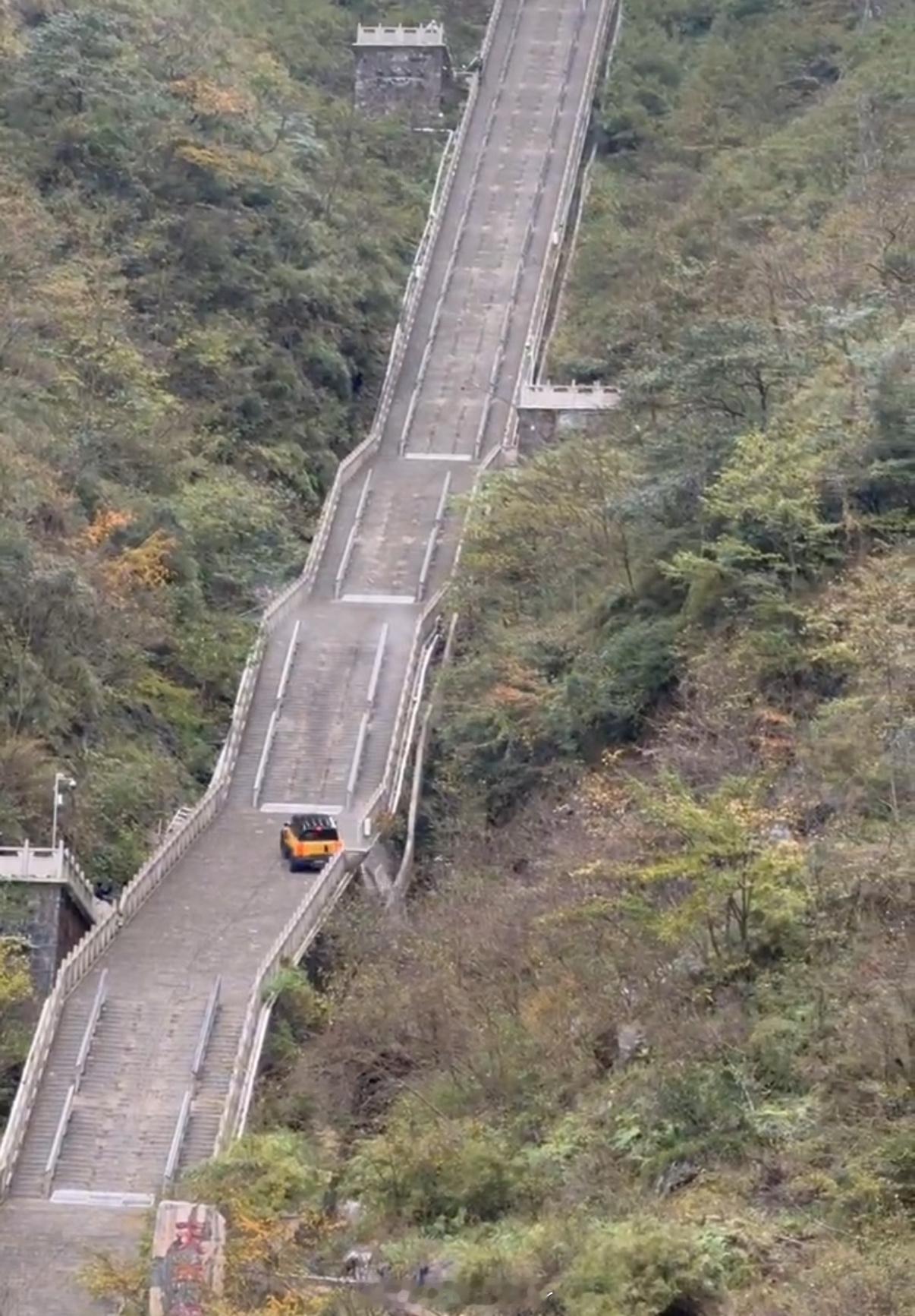 天门山的物理课,奇瑞听懂了吗?一辆黄色奇瑞风云X3L在天门山的台阶上倒退、撞击