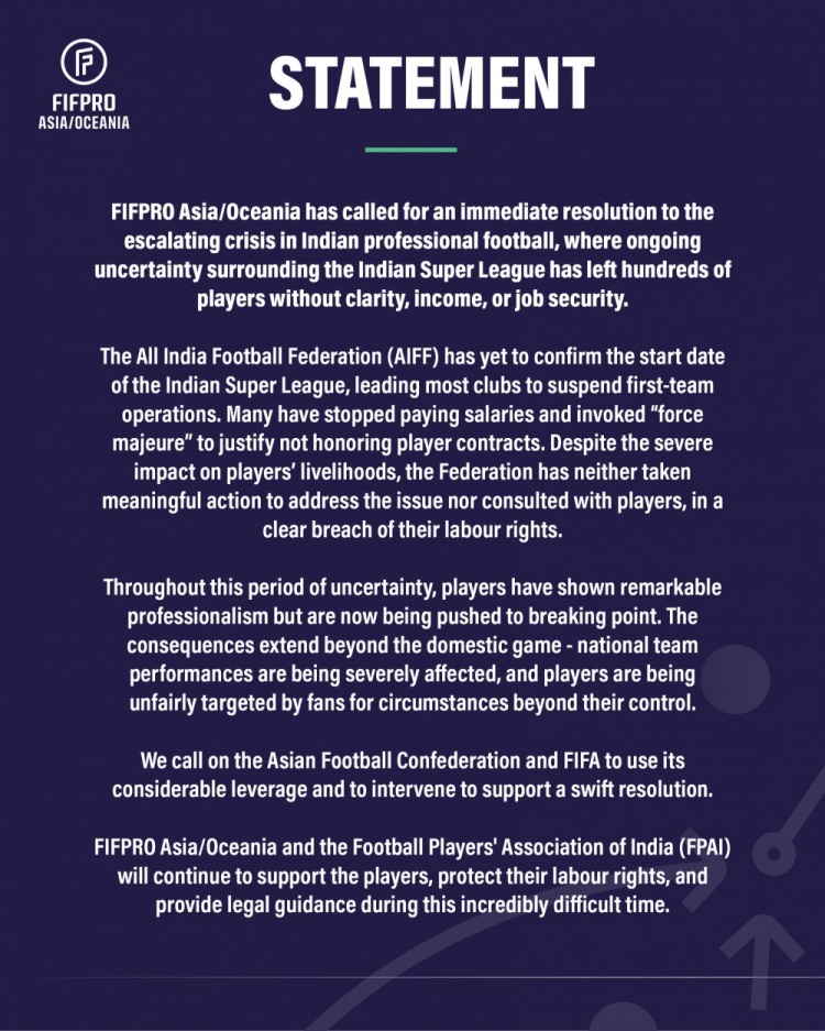 国际职业足球运动员协会亚洲/大洋洲分会呼吁立即解决印度职业足球日益加剧的危机,印度超级联赛持续的不确定性已导致数百名球员陷入前景不明、收入中断、工作保障缺失的困境。