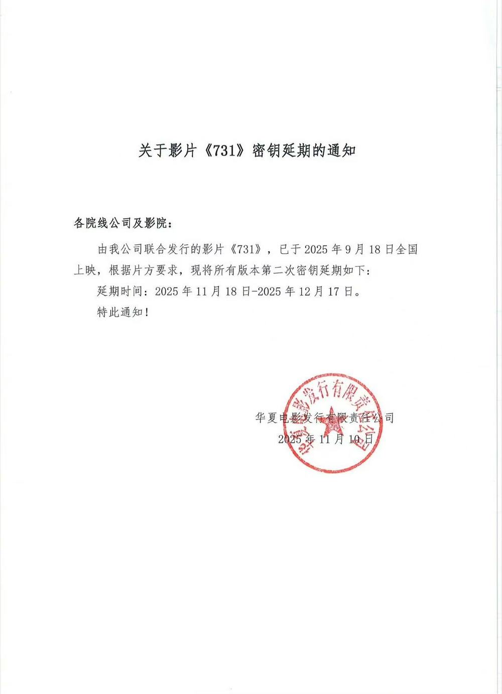 电影《731》密钥第二次延期,延长上映至12月17日,据猫眼专业版数据,截至当前影片累计票房已超19.40亿元。
