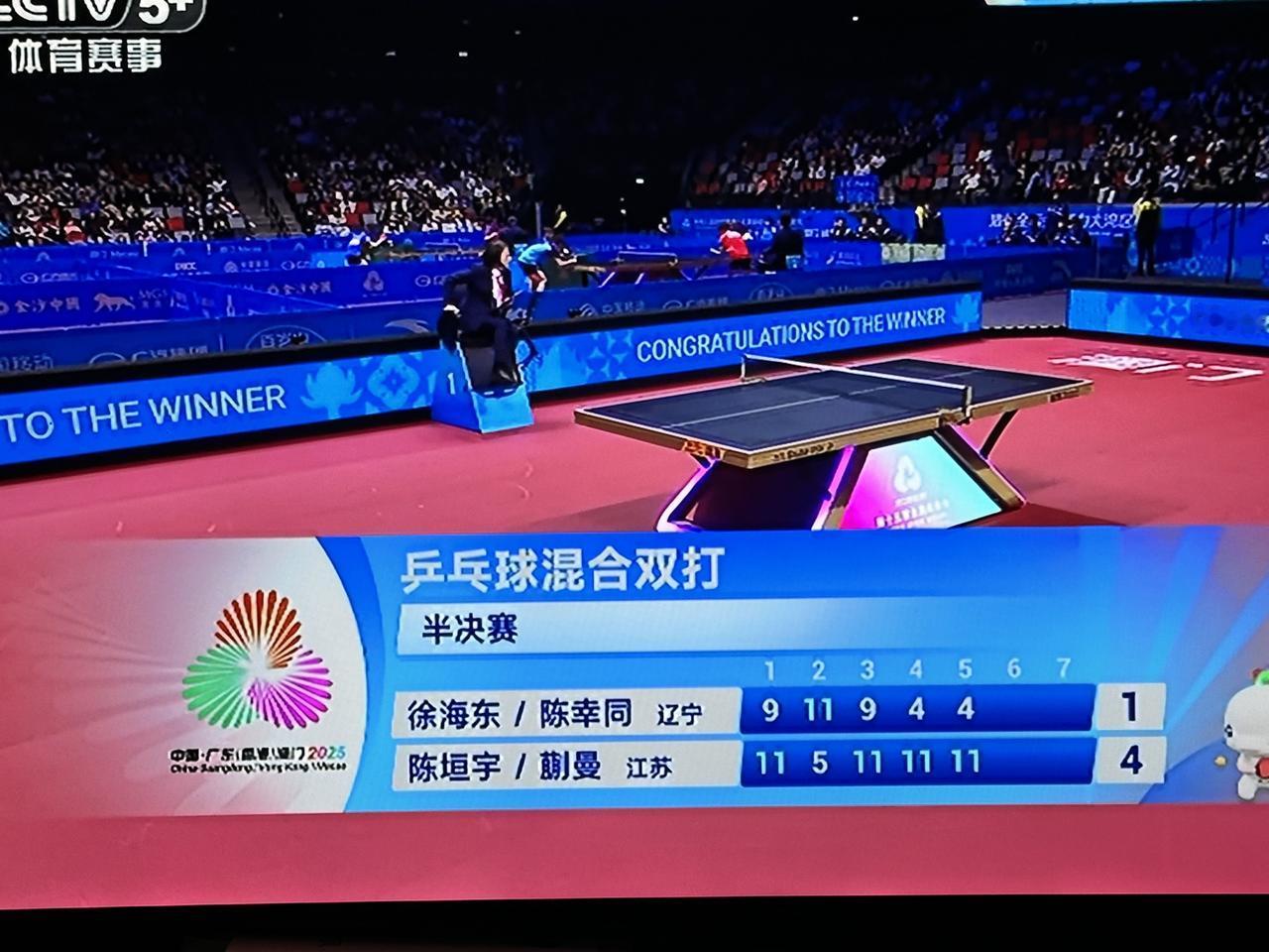 祝贺孙颖莎! 祝贺蒯蔓陈垣宇组合! 混双半决赛的解说员情商太高了!赞! 我家的电视居然收看不到孙颖莎参加的全运会乒乓女单四分之一决赛。 我收看到的是CCTV5+频道的混双半决赛,对阵双方是江苏队的蒯蔓与陈垣宇对阵辽宁队的陈幸同与徐海东。 比赛在如火如荼的进行着,我其实并不很关注这场比赛,我心里关注的是孙颖莎。 非常有趣的是,这场混双半决赛的解说员在局间休息时带了一句孙颖莎的赛况:第三局结束时,解说员说了一句“比赛来到第三局,孙颖莎领先。”被我听到了,赶紧记了下来。混双半决赛快结束时,解说员又说了一句孙颖莎的赛况:“孙颖莎以四比零的大比分战胜对手顺利晋级半决赛,半决赛的对手是朱雨玲。”也让我听到了,很开心。这解说员情商太高了。 祝贺孙颖莎!祝贺蒯蔓陈垣宇组合!