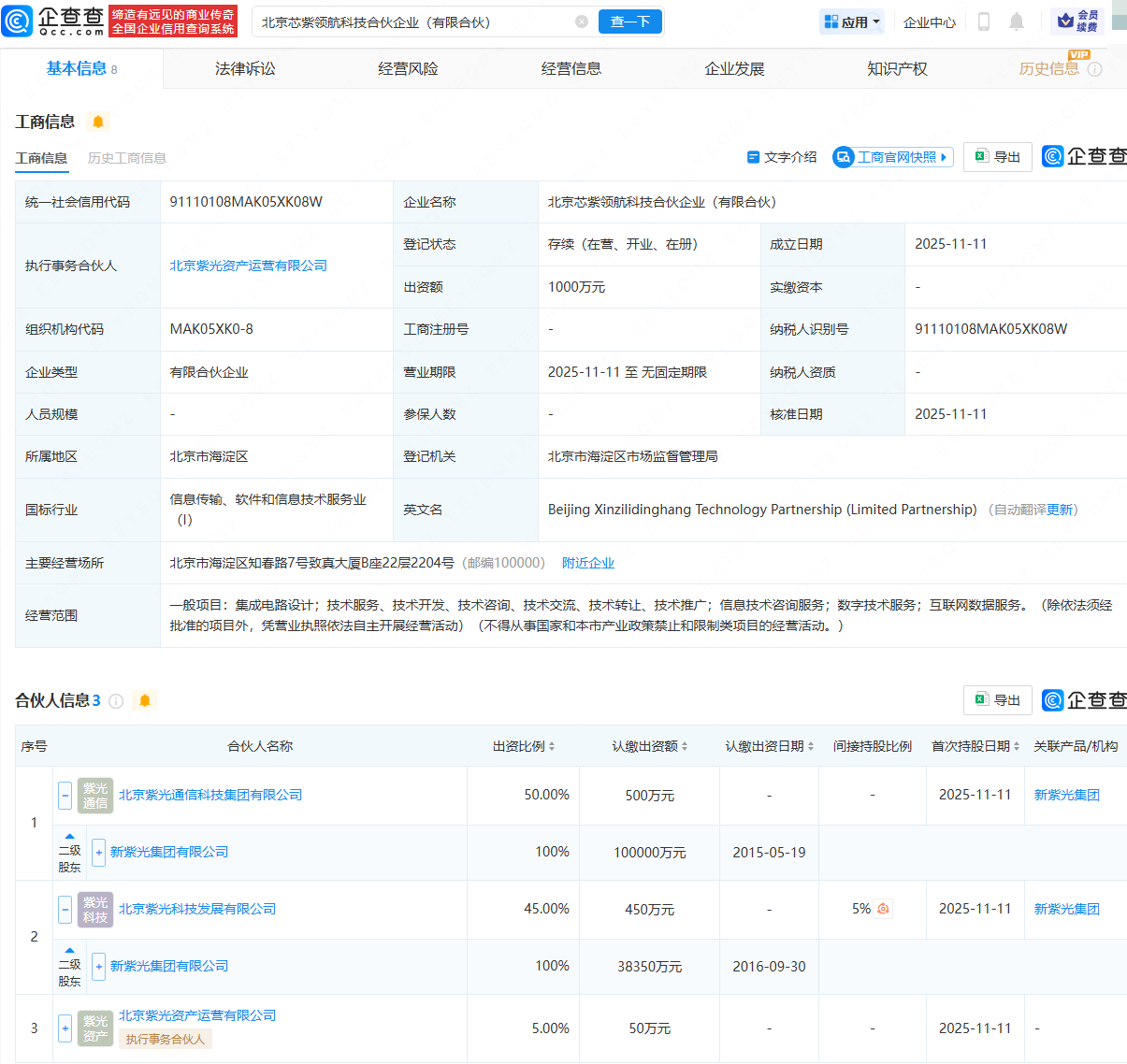 企查查APP显示,近日,北京芯紫领航科技合伙企业(有限合伙)成立,出资额1000万元,经营范围包含:集成电路设计;信息技术咨询服务;数字技术服务;互联网数据服务等。企查查股权穿透显示,该合伙企业由新紫光集团有限公司旗下北京紫光通信科技集团有限公司、北京紫光科技发展有限公司等共同持股。