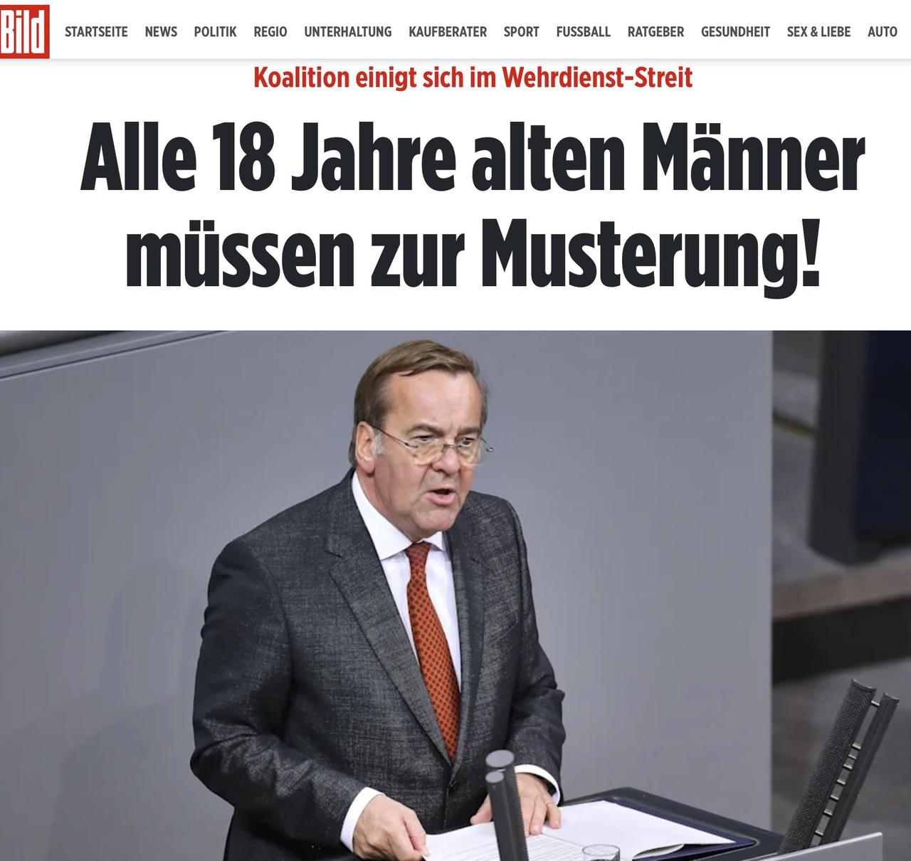 扩军!扩军!德国18岁男子一个跑不掉、全都得抽签认命: 刚刚,柏林已经正式通过法案:“德国所有18岁男性都必须参加征兵体检!若符合服兵役条件的自愿者人数不足,则将通过抽签决定谁能入伍!” 也就是说,体检将成为强制性措施,他们希望德国青年最好都能自愿申请加入德国联邦国防军。如果自愿服兵役制度失败(人数不够),德国联邦将采用所谓的“按需征兵”制度,该制度很可能采用随机抽签的方式。 抽签充人头,这德国的未来,不妥妥成泰国了吗?