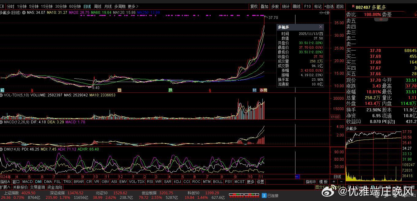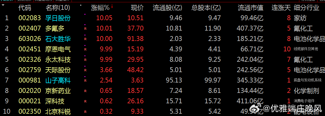 【财富晚茶】十大利好(11.13):追寻沪深北市十大利好信息的股票导语:作者系《网易号》优质财经领域创作者。曾经原创作者和知名网易号旅游领域创作者。大跨度行业等的写作,颇受网友喜爱。作品发表于 2025.11.13.23:58 优雅端庄晚风。编者的话:追寻市场:蛛丝马迹动态趋势。今天主题:【财富晚茶】十大利好(11.13):追寻沪深北市十大利好信息的股票。最新市场:新鲜出炉:2025.11.13.23:58 十大利好股票参考。偏重其中:机构分析、龙虎榜数据、高成长性潜力等。综合筛选:涵盖家纺、氟化工、消费电子等领域。兼顾短期:热点长期估值。每个股票:附简要利好原因。一、主力资金:市场表现前三佳股票孚日股份 (002083) 多氟多 (002407) 石大胜华 (603026)二、主力资金:十大利好信息的股票1、孚日股份 (002083)核心逻辑:作为VC概念龙头。晚间点评:连续6个涨停板,累计涨幅达77.23%。主力资金3日净流入9.85亿元,机构席位参与度高,游资持续加仓。技术面突破年线压制,MACD金叉,短期上升趋势明确。2、摩恩电气 (002451)核心逻辑:当日实现8连板,成为市场最高连板股。晚间点评:资金聚焦于其新能源或电力设备相关概念。3、永太科技 (002326)核心逻辑:VC核心生产商,产能行业领先。晚间点评:11月13日主力资金净流入4.32亿元,机构买入占比65%,量价齐升突破前期高点。4、石大胜华 (603026)核心逻辑:电解液核心供应商。晚间点评:受益于锂电池需求爆发。当日主力资金净流入3.87亿元,大单买入占比78%,技术面突破下降趋势线。5、多氟多 (002407)核心逻辑:六氟磷酸锂龙头。晚间点评:产能扩张加速,主力资金净流入5.23亿元,机构与游资合力介入。6、天际股份 (002759)核心逻辑:VC概念弹性翘楚。晚间点评:主力资金净流入4.65亿元,早盘低开后快速拉升显示承接力强。7、北京科锐(002350)核心逻辑:AI服务器电源领域龙头。晚间点评:专注于12kV配电制造。电气类业务营收占比超94%。投资18.3亿元建设重庆合川区储能项目,拓展第二增长曲线。涉足半导体材料业务,叠加氢能源综合解决方案,形成多元化业务矩阵。8、深科技(000021)核心逻辑:存储芯片封测龙头。晚间点评:国内最大DRAM封测厂商,SK海力士核心代工厂。AI服务器存储需求推动产能供不应求。9、山子高科(000981)核心逻辑:聚焦新能源与半导体双赛道。晚间点评:剥离房地产等回笼资金超13亿元,集中新能源汽车零部件和半导体领域。聚焦BOX1纯电物流车,已获美团目标销量5000辆。与哪吒汽车重组,有望获得成熟整车技术与渠道。10、京新药业(002020)核心逻辑:核心品种(如瑞舒伐他汀钙片)通过集采“以价换量”。晚间点评:创新药:地达西尼胶囊(失眠领域1类新药)2024年纳入医保后快速放量,2025年上半年营收5500万元。美国、越南等基地提升供应链韧性,原料药通过FDA/CEP认证,拓展欧美市场。风险提示1、部分科技板块亦或估值偏高需留意外部环境。2、美联储政策中美贸易摩擦内部经济不确定性。三、主力资金:其他利好信息的股票1、电解液LiFSI原料天赐材料(002709)核心逻辑:全球电解液龙头。晚间点评:凭借六氟磷酸锂、LiFSI等核心原料的99%自供率,单吨净利领先二线厂商近1000元。与国轩高科签订电解液产品采购协议,2026-2028年度预计采购总量为87万吨,长期合作利好业绩。2、锂矿矿石盐湖天齐锂业(002466)核心逻辑:通过控股澳大利亚格林布什锂矿。晚间点评:形成“矿石+盐湖”双资源供应体系,资源自给率超100%?。固态电池:持有北京卫蓝5%、SES约10.83%股权,并合资设立深圳固锂,布局预锂化负极及金属锂材料。四、 创作不易:优质网易财经作者投资投机迷茫之中:给予尽可能有帮助:资本市场风险自负。(优雅端庄晚风《网易号》财经领域创作者和原创作者 违者必究)