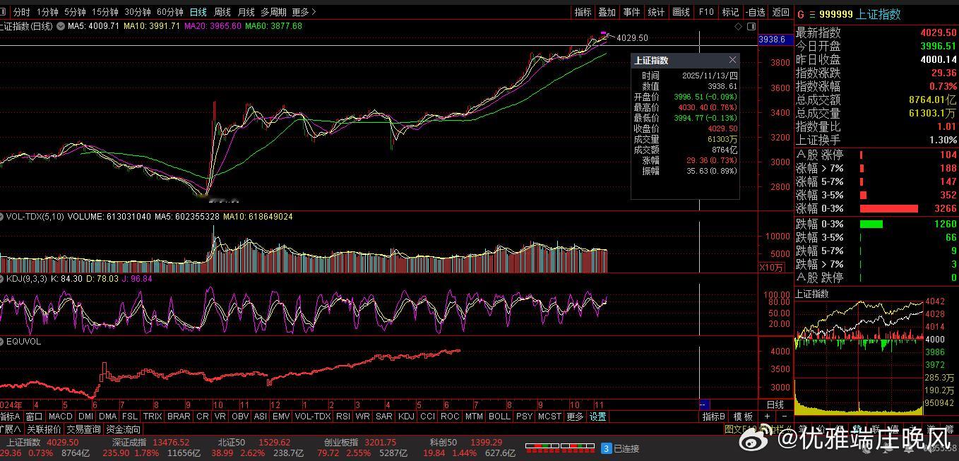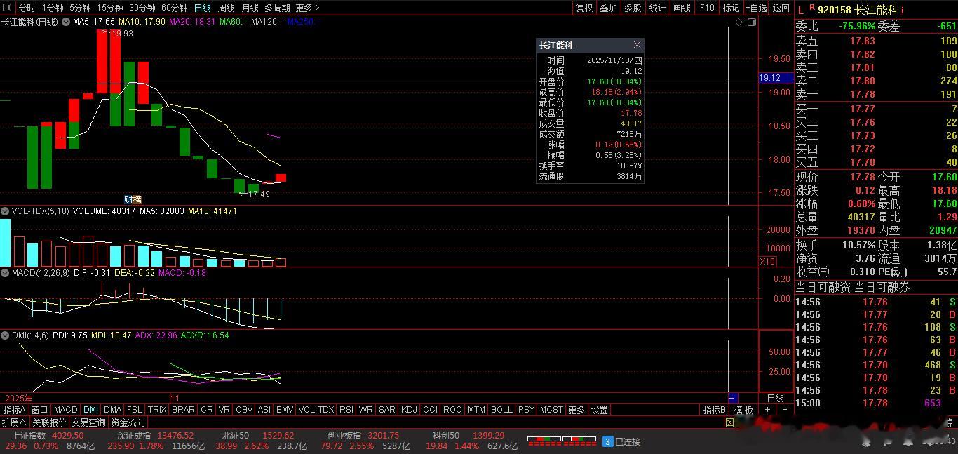 【财富晚茶】今日股市收评:深指涨1.78%:能源震荡回升公路杀跌导语:作者系《网易号》优质财经领域创作者。曾经原创作者和知名网易号旅游领域创作者。大跨度行业等的写作,颇受网友喜爱。作品发表于2025.11.13.15:18优雅端庄晚风。一、视野焦点:恰似“火眼金睛”920158 长江能科 盘中 02涨1、突破一年箱底视野盘面:前期双顶:突破双底:2025-11-13 截至1500:股价报收:17.78元。股指上涨:0.68%。成交总量:40317手,成交金额:7215万元。总换手率10.57%,观总市值:24.55亿元。流通市值:6.78亿元。2、能化设备翘楚品牌经营:能源化工专用设备研产和销售。公司品牌:电脱设备市场占有率居国内第一。3、营收净利尚可业绩好转:2025-09-30 半年度报:公司营收:2.0866亿 同比增5.15%。公司净利:3304.1149万 同比增3.75%。二、多方强势:恰似“弱肉强食”1、博弈追踪盘面第一、沪深盘面透析沪深回放:跌宕起伏。早盘:低开触底,六涨冲顶。午盘:一涨二跌,二涨一跌。尾盘:五涨封喉,最高红盘。第二、透析沪深指数追寻沪深:跌宕起伏。沪指涨0.73%(029.36点),报04029.50点,成交额08764亿。深指涨1.78%(235.90点),报13476.52点,成交额11656亿。创指涨2.55%(079.72点),报03201.75点,成交额05287亿。北指涨2.62%(038.99点),报01529.62点,成交额00238亿。沪深北市:合计成交:20659亿元。2、复盘沪深个股第一、今日个股视野今日观察:涨跌互动。3953上涨,118个股涨停板。1338股下跌,1股跌停板。沪深北市:合计成交20659亿元。三、沪深阳棒:恰似“阳春白雪”1、洞察机构尾盘主旋律:沪深弱势,尾盘反弹。沪指距9:31-15:00:前1小时放量盘升,中2小时略量盘升,后1小时略量盘升。深指距9:31-15:00:前2小时放量盘升,中1小时略量盘跌,后1小时略量盘升。沪深两市:合计成交:20659亿元。四、资金流向:恰似“水落石出”1、目击主力资金Wind统计显示:主力资金今日净流入124.7亿元;其中,创业板主力资金净流入54.5亿元;沪深300成份股主力资金净流入75.6亿元;科创板主力资金净流出17.09亿元。申万所属的31个一级行业,今日有12个行业主力资金呈现净流入,其中,电力设备行业主力资金净流入最多,净流入金额为94.41亿元;行业主力资金净流入居前:有色金属、化工、机械设备等。19个行业主力资金呈现净流出,其中,医药生物行业主力资金净流出最多,净流出金额为18.9亿元;行业主力资金净流出靠前:电子、食品饮料、家用电器、计算机、建筑装饰等。2、龙虎榜晴雨表收盘龙虎榜数据:机构席位资金合计:净买入约6.25亿元。其中,净买入的个股17只,净卖出的个股9只。机构净买入最多:海博思创,净买入金额约3.82亿元;机构净买入居前:天赐材料、万润新能、海科新源、英维克、上能电气等股。机构净卖出最多:天际股份,净卖出金额约4.02亿元;机构净卖出居前:永太科技、方正电机等股。3、涨停板跌停板第一、板块涨停上涨板块:能源金属、林业、电池、青海板块、锂矿等。下跌板块:电信服务、公路铁路、航天装备、送转超跌、电力等。第二、个股涨跌沪深个股:涨多跌少,多方强势,略胜一筹。其中,3953上涨,118个股涨停板。1338股下跌,1股跌停板。沪深北市:合计成交20659亿元。4、明天趋势先知第一、沪指预测11月14日:沪指突破阻力:04030点看涨,前程似锦;跌破支撑位:03994点看跌,日暮途穷。第二、深指预测11月14日:深指突破阻力:13488点看涨,鹏程万里;跌破支撑位:13222点看跌,不堪造就。五、本创作者:恰似“优质网易”投资投机迷茫之中:给予尽可能有帮助:资本市场风险自负。(优雅端庄晚风《网易号》优质财经领域创作者和原创作者; 违者必究)