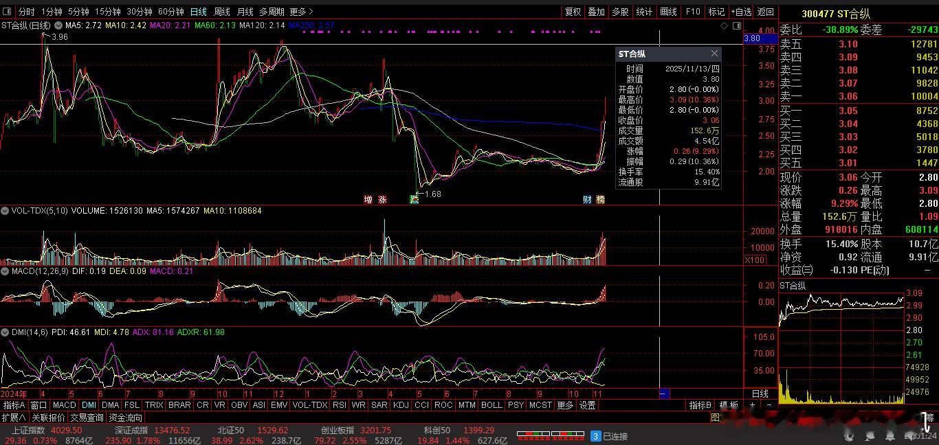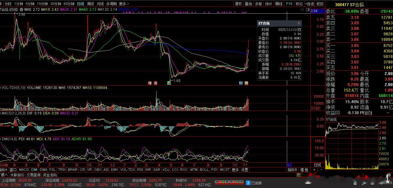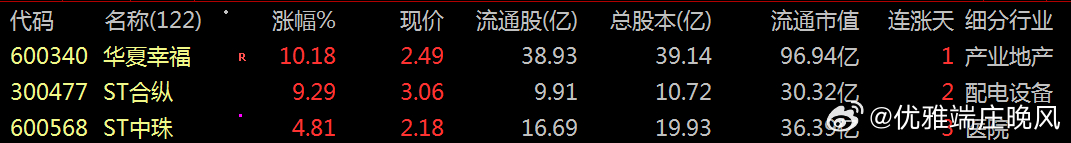 【财富晚茶】三元股市收评:沪指涨0.73%:玻璃强势上扬电信探底导语:作者系《网易号》优质财经领域创作者。曾经原创作者和知名网易号旅游领域创作者。大跨度行业等的写作,颇受网友喜爱。作品发表于2025.11.13.15:18优雅端庄晚风。(标题照片:全球著名意大利顶级玻璃品牌:Barovier & Toso)一、ST合纵:三年筑底300477 ST合纵 盘中 02涨1、三年底部:等待突破视野盘面:前期双底:见底脉冲。2025-11-13 截至15:00:股价报收:3.06元。该股上涨9.29%。成交总量:152.6万手,成交金额:4.54亿元。总换手率15.40%,观总市值:30.30元。流通市值:30.30亿元。2、一流配电:头部企业主营业务:配电变电控制设备-锂电池正极前驱体研造和销售。公司品牌:一流配电智慧能源领域系统解决方案服务商和先进锂电池材料前驱体供应商。3、营收减少:净利减亏财报透视:2025-09-30 一季度报:公司营收:11.0907亿 同比增-48.72%,实现净利润-1.352亿 同比增25.13%。二、多空搏杀:沪深红盘1、追踪盘面:蛛丝马迹。沪深场景:早盘:低开触底,六涨冲顶。午盘:一涨二跌,二涨一跌。尾盘:五涨封喉,最高红盘。看点之一:沪深股指:股指低开:盘中强势:瞬间拉升。沪指走强:涨幅近1%。持续叠创:10年新高。看点之二:市场黑马:创指涨超2%。看点之三:沪深北市:合计成交:20659亿元。场内个股:3953股飘红。2、板块涨跌:风口依然涨跌观察:板块见证。板块拉升:玻璃、有色、化工、煤炭、钢铁等。板块拉升:地产、医药、半导体等。板块回调:电信、公路、航天等。概念走高:锂电、有机硅、储能等。3、技术看盘:涨跌位置观K线提示:精彩多空博弈。沪深两指预测:11月14日:沪指突破阻力:04030点看涨,前程似锦;跌破支撑位:03994点看跌,日暮途穷。深指突破阻力:13488点看涨,鹏程万里;跌破支撑位:13222点看跌,不堪造就。三、三元板块:风口潜水1、追踪盘面:视角视野三元走强拓展,沪深强势冲顶。104股上涨,涨幅5%以上:11股涨停板。13股下跌,跌幅5%以上:0股跌停板。涨幅0%:5股0停板。涨幅0.00%+上涨个股:5+104=109股票赚钱。沪深两市:合计成交20659亿元。总体归纳:三元股票:盘口强势。2、追踪盘面:主力进退换位思考:沪深强势,尾盘抢筹。沪指距9:31-15:00:前1小时放量盘升,中2小时略量盘升,后1小时略量盘升。深指距9:31-15:00:前2小时放量盘升,中1小时略量盘跌,后1小时略量盘升。沪深两市:合计成交:20659亿元。四、透析个股:聚焦涨跌1、涨幅榜眼:处排查摸主旋律:涨幅榜之中:寻找启动600340 华夏幸福 300477 ST合纵 600568 ST中珠涨幅榜-1:600340 华夏幸福主营业务:产业新城-商业地产。公司品牌:中国产业新城服务商。涨幅榜-2:300477 ST合纵主营业务:配电变电控制设备-锂电池正极前驱体研造和销售。公司品牌:一流配电智慧能源领域系统解决方案服务商和先进锂电池材料前驱体供应商。涨幅榜-3:600568 ST中珠主营业务:药品-肿瘤治疗产品-住宅地产开发。公司品牌:大健康-肿瘤治疗头部企业。2、跌幅榜眼:处排查摸主旋律:跌幅榜之中:寻找金子300391 *ST长药 002306 *ST云网 000826 启迪环境跌幅榜-1:300391 *ST长药主营业务:医药制造-通用设备制造-新能源。公司品牌:亚洲最有影响力道地药材全产业链头部供应商。跌幅榜-2:002306 *ST云网主营业务:餐饮团膳-互联网游戏运营。公司品牌:餐饮团膳和新能源光伏领先企业。跌幅榜-3:000826 启迪环境主营业务:数字环卫-水务生态-固废处置。公司品牌:专业化环境治理整体解决方案和头部企业。3、潜力榜眼:处排查摸主旋律:潜力榜之中:寻找估值002496 *ST辉丰 300301 *ST长方 000669 ST金鸿潜力榜-1:002496 *ST辉丰主营业务:生物农资-农资电商-石化仓储供应链-项目投资。公司品牌:中国领先亚临界小分子高温裂解工艺高科技专利产品和头部企业。潜力榜-2:300301 *ST长方主营业务:LED照明光源器件。公司品牌:LED照明光源器件头部企业。潜力榜-3:000669 ST金鸿主营业务:天然气。公司品牌:国内最具实力的综合性清洁能源服务商。五、本创作者:优质网易投资投机迷茫之中:给予尽可能有帮助:资本市场风险自负。(优雅端庄晚风《网易号》优质财经领域创作者和原创作者; 违者必究)