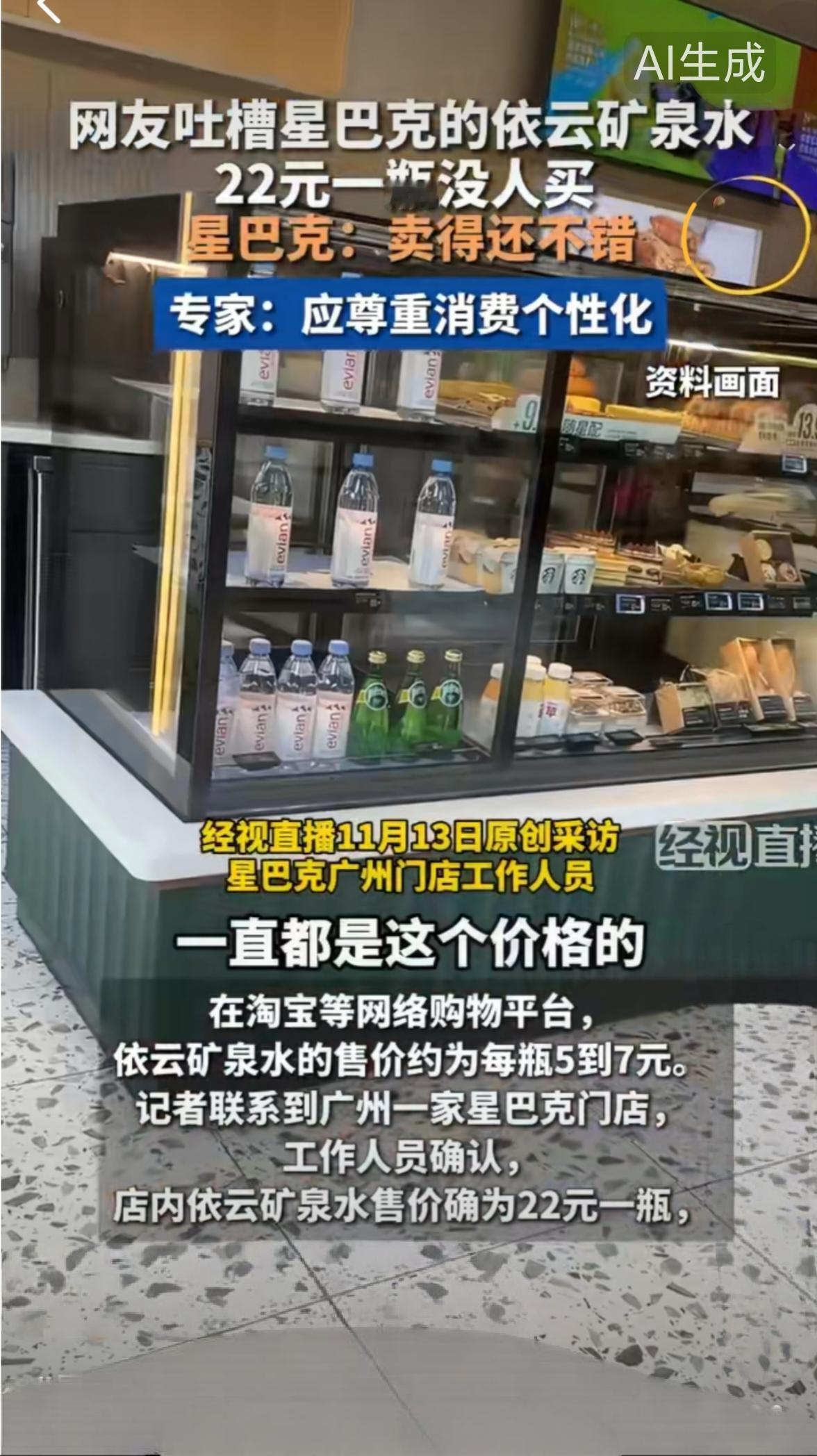 星巴克的东西就是好,一瓶水22元 11月13日,经视直播记者联系到广州一家星巴克门店。工作人员确认,店内依云矿泉水售价确为22元一瓶,并称“矿泉水大概进货渠道不一样,经常都会有人点。” 据说这水是来自法国阿尔卑斯山的弱碱性水,这样来说也不贵。试想一下,水最贵的成本部分是包装和运输,从法国远渡重洋来到大陆能不贵吗?本来是大山取水难,运费加上关税等等。再说LⅤ包都几万一个,不照样有人买吗?人家要的就是那感觉,明码标价,公平交易无可厚非。 突然想起传说好多年前的一封电报,说的是地区差异的“人傻钱多速来”,不知道是笑话还是实事。我是个穷人思维,没有钱,只想把钱用到正事上,所以也没有挣到钱。认知有限,人傻钱少。