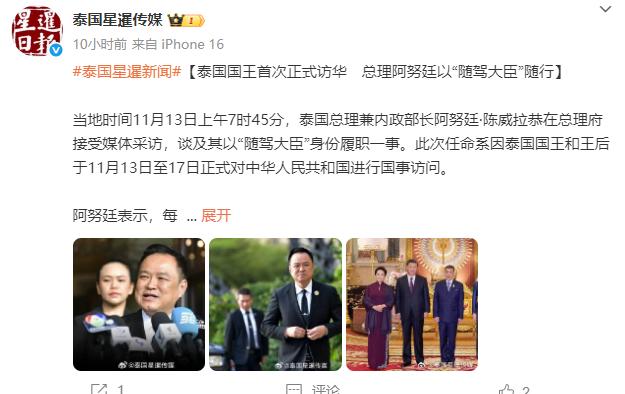 泰国总理阿努廷也跟着玛哈国王来访华了! 11月13日,泰国玛哈国王和苏提达王后抵