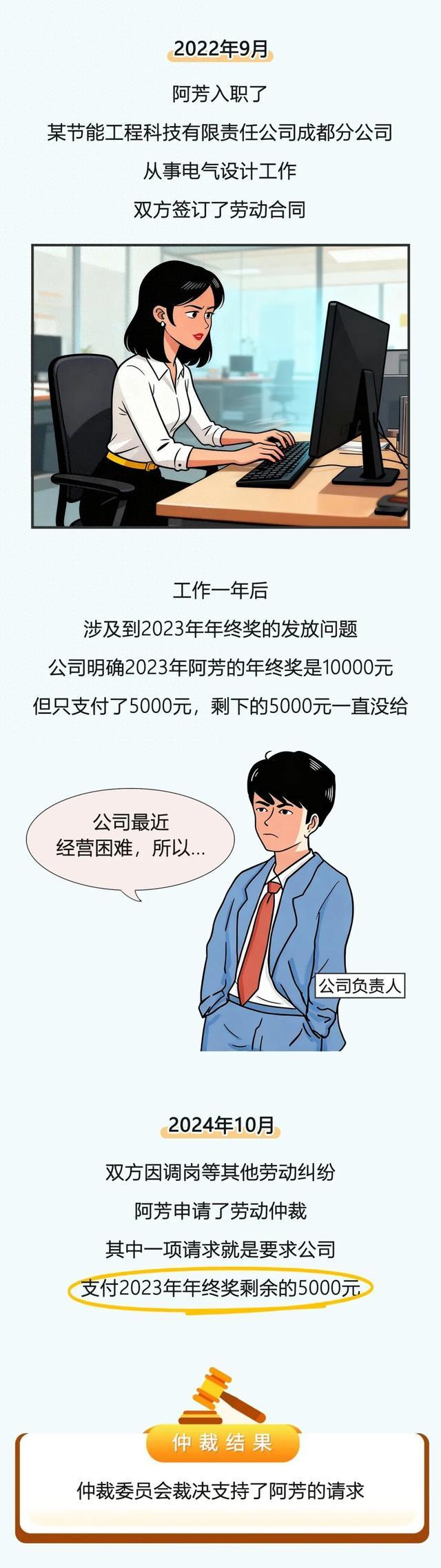 本案中,面对阿芳的请求,成都分公司于仲裁期间确认以下事实:2023年度阿芳应获年终奖金额为人民币10000元,其中5000元已支付,剩余5000元因经营困难尚未支付。