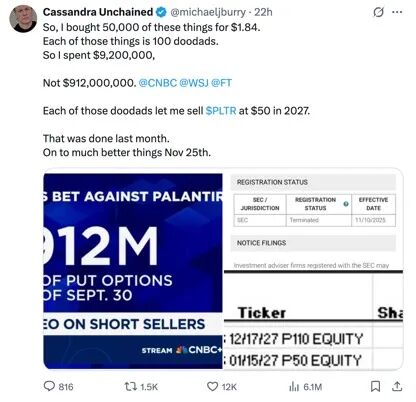 此前,媒体报道称,Burry旗下对冲基金ScionAssetManagement披露的第三季度持仓报告显示,该基金持有名义价值超过10亿美元的看跌期权(占其资产总值的80%),押注对象为英伟达和数据分析公司Palantir。其中,Palantir看跌期权价值约9.12亿美元和英伟达看跌期权价值约1.87亿美元。