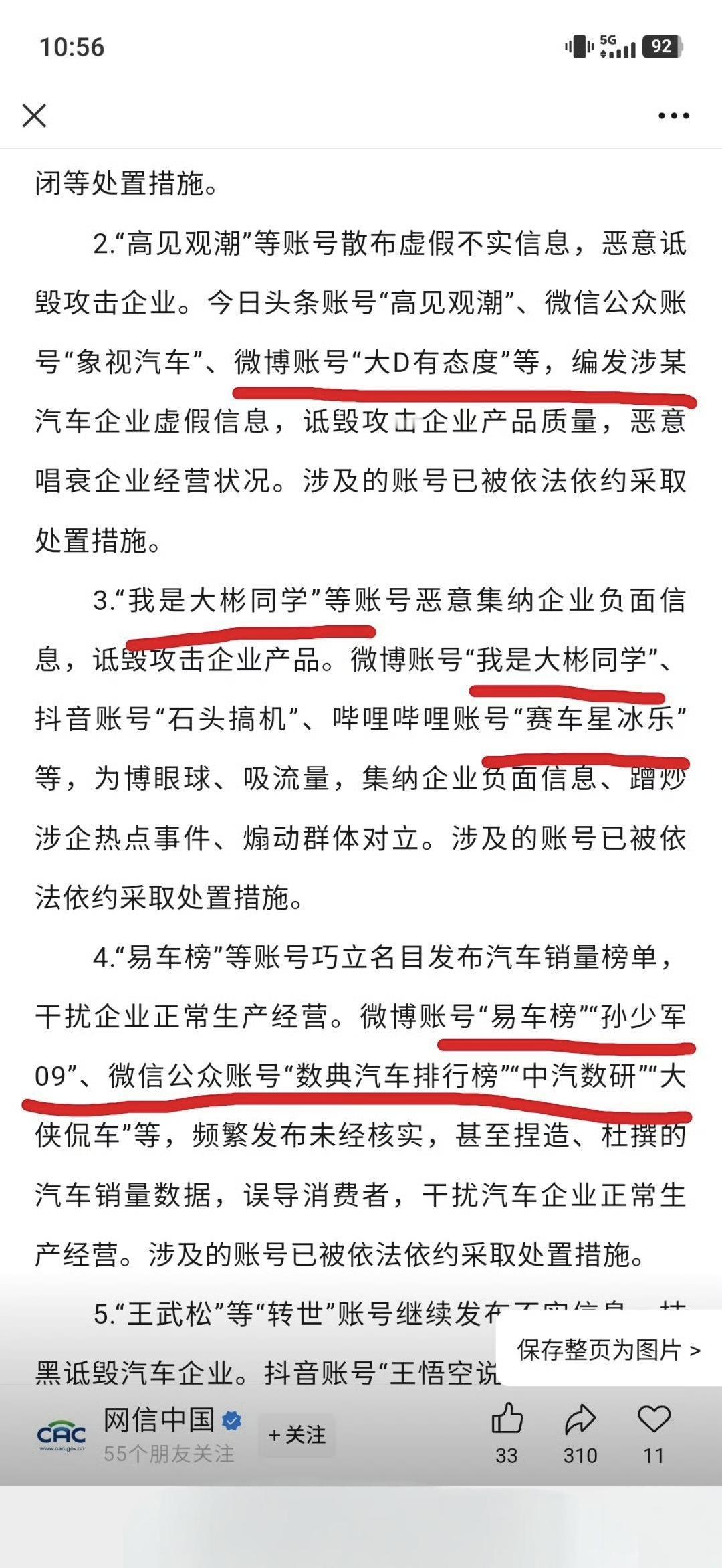 这次是网信办出手了,力度很大! 涉及到的大号很多,包括易车,中汽数研,孙少军09都被处罚。 以后周销量数据是不能轻易发的,上头出手整治无意义的内卷很有必要。 恶意抹黑汽车企业的账号被处理【来自懂车帝车友圈】