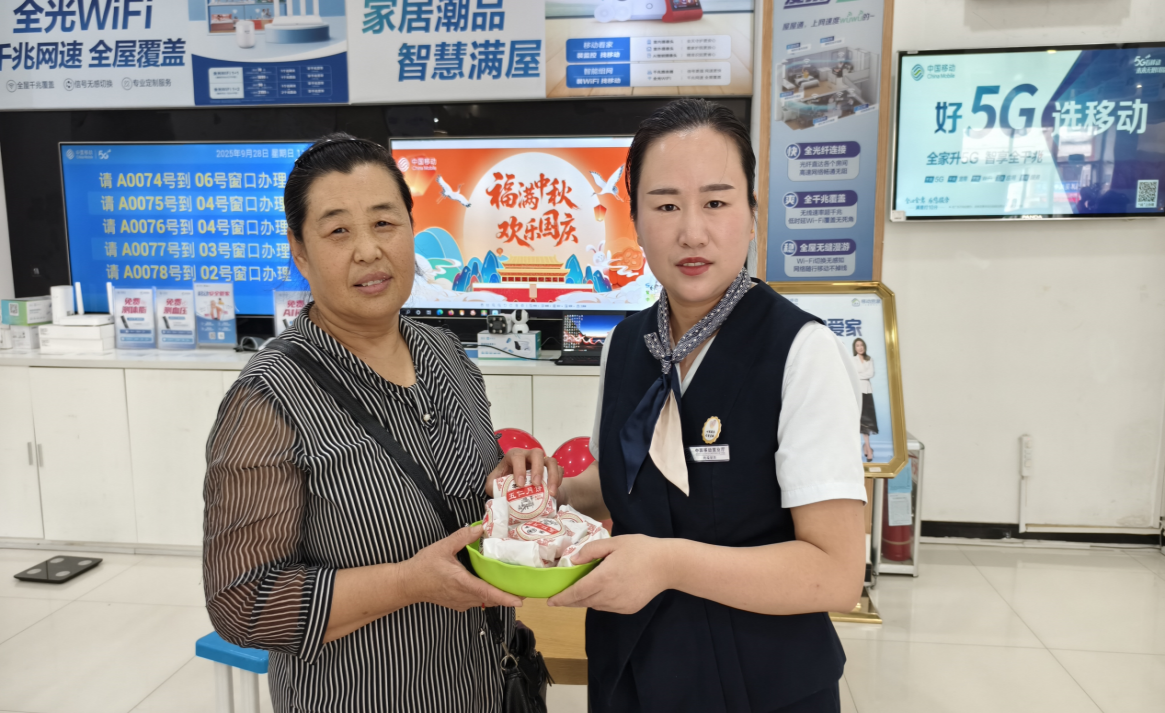 为进厅办理业务的客户送上一枚月饼,让客户享受暖暖的温情,客户表示满满的温暖和感动,为移动点赞。