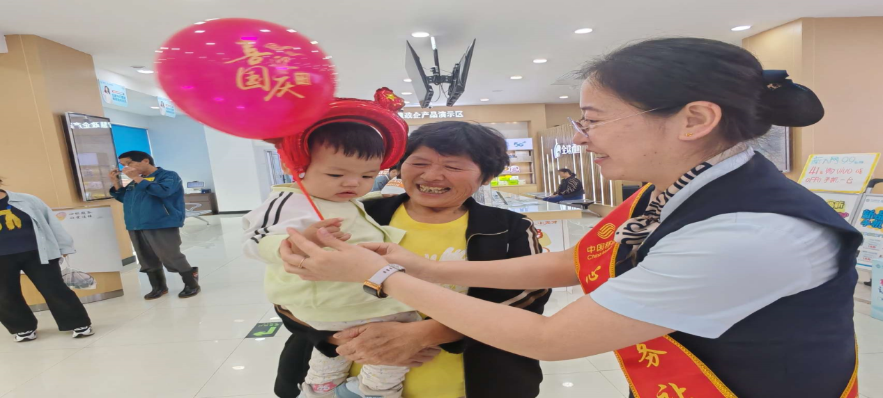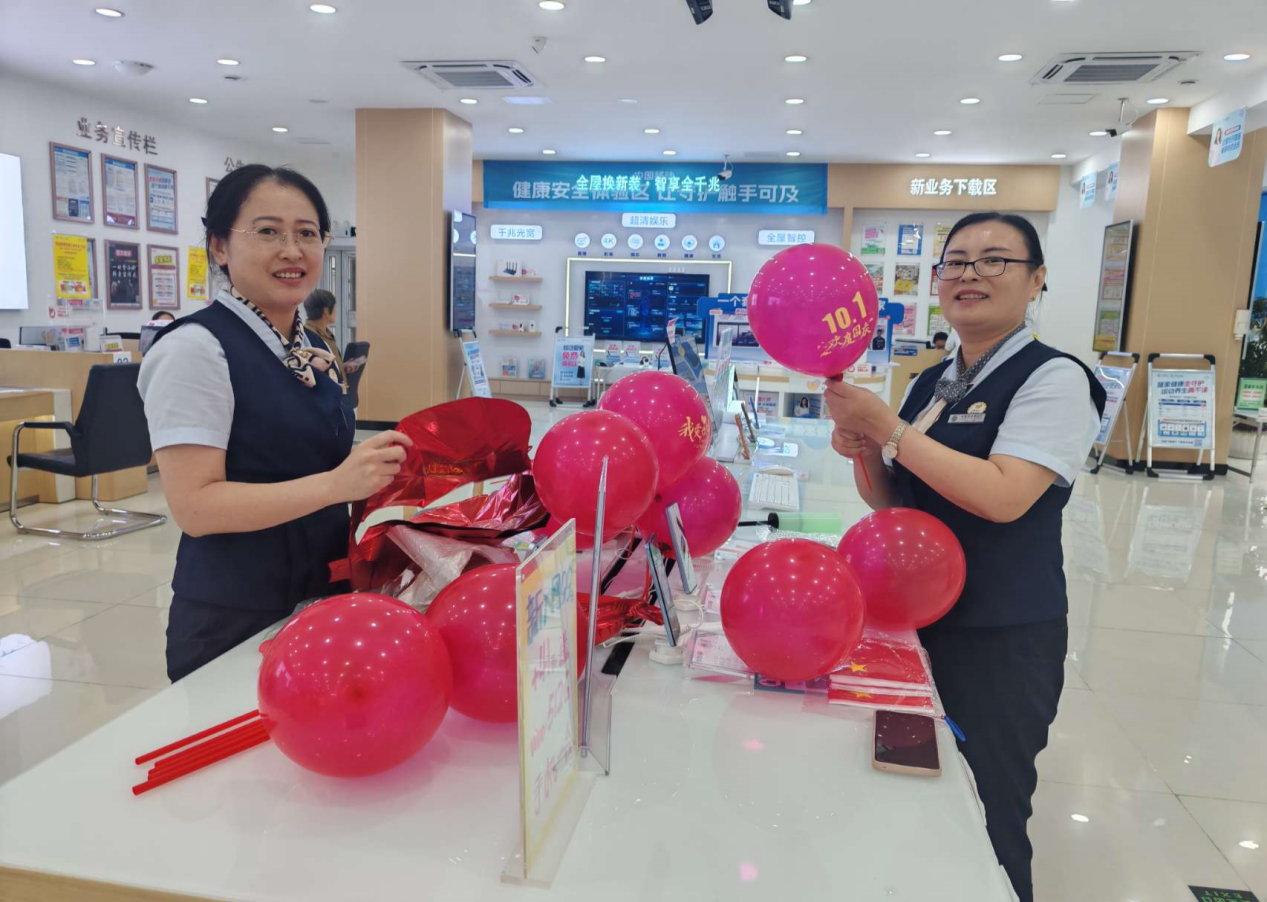 营业厅添彩中国红,厅内红旗飘扬,摆满了大红的爱心气球,进厅客户赠送小红旗、手持皇冠爱心气球、儿童国庆发箍等,让每一位进厅客户感受到浓厚的节日氛围,大家用不同形式表达着相同的爱国情怀。