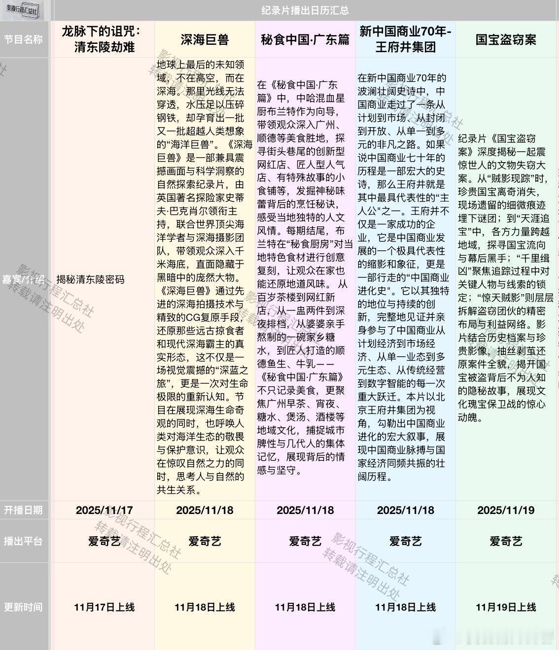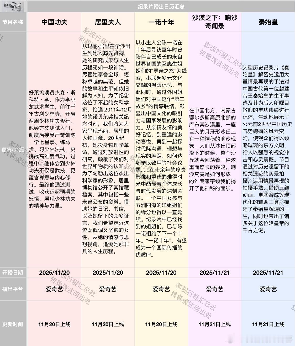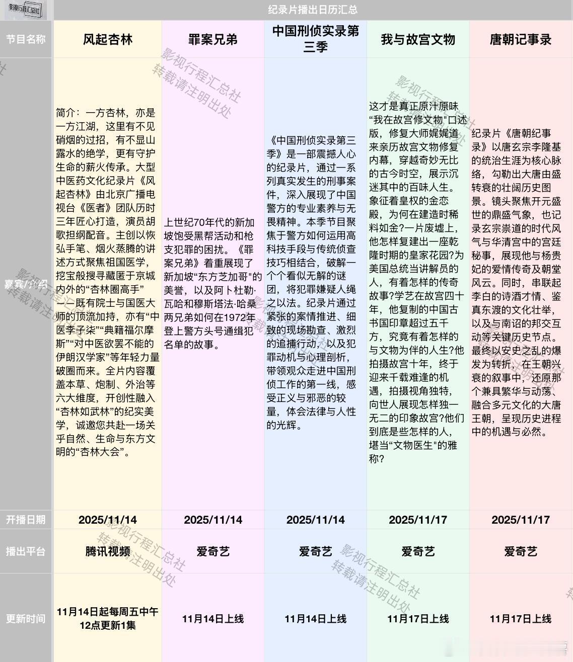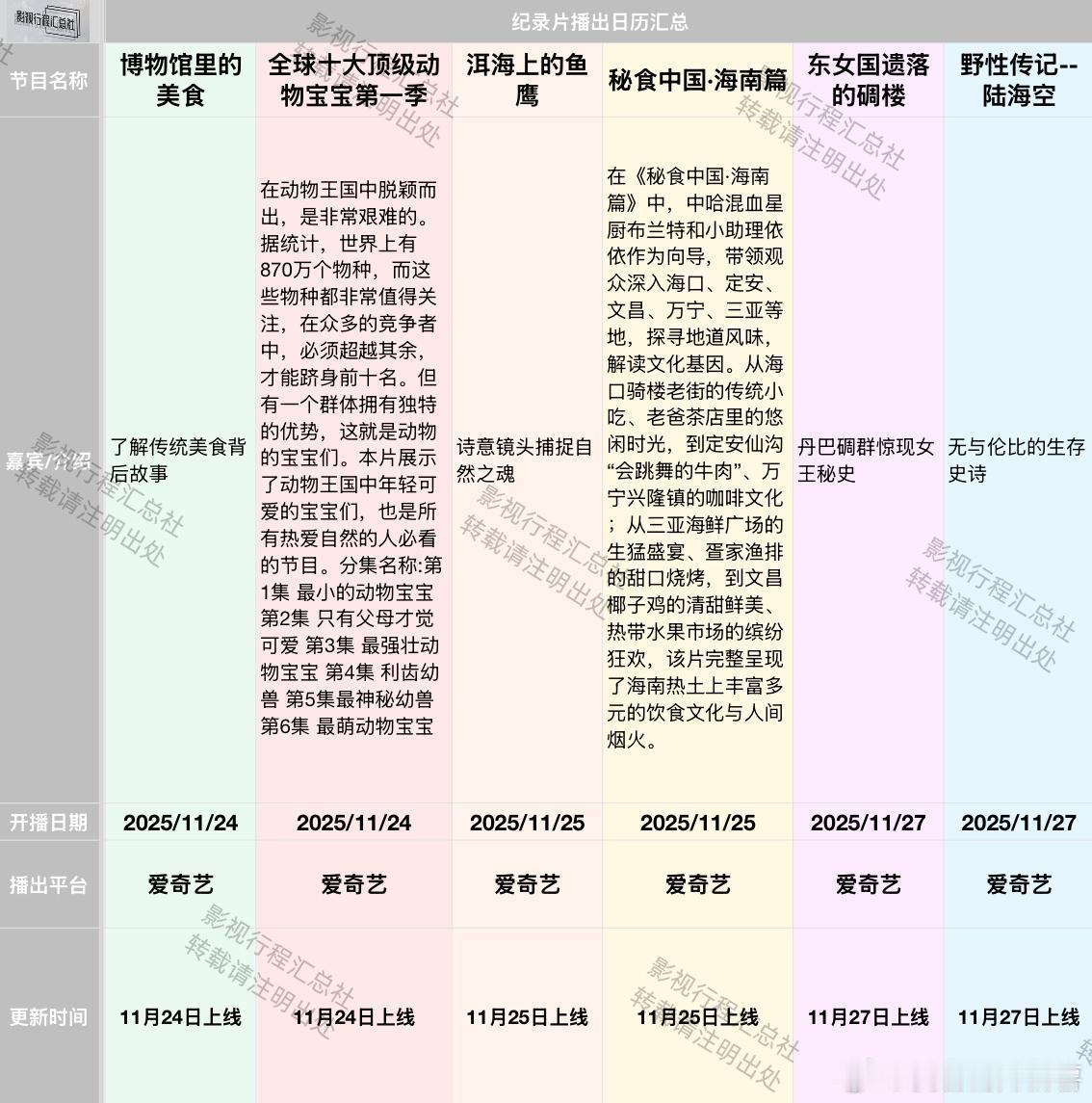 《奔跑吧天路篇》定档11.22综艺日历更新:11.14-11.27日开播综艺《健康脱口秀·第5季》口口医生等 2025/11/16 上海教育电视台、上海健康频道、腾讯、优酷、B站、健康云《奔跑吧天路篇》李晨、郑恺、沙溢、白鹿、范丞丞、宋雨琦、张真源、李昀锐、敖瑞鹏、翟子路、王楚然、徐志胜、沈羽洁 2025/11/22 浙江卫视、Z视介、腾讯视频、爱奇艺、优酷纪录片:《风起杏林》 2025/11/14 腾讯视频《罪案兄弟》 2025/11/14 爱奇艺《中国刑侦实录第三季》 2025/11/14 爱奇艺《我与故宫文物》 2025/11/17 爱奇艺《唐朝记事录》 2025/11/17 爱奇艺《龙脉下的诅咒:清东陵劫难》 2025/11/17 爱奇艺《深海巨兽》 2025/11/18 爱奇艺《秘食中国·广东篇》 2025/11/18 爱奇艺《新中国商业70年-王府井集团》 2025/11/18 爱奇艺《国宝盗窃案》 2025/11/19 爱奇艺《中国功夫》 2025/11/20 爱奇艺《居里夫人》 2025/11/20 爱奇艺《一诺十年》 2025/11/20 爱奇艺《沙漠之下:响沙奇闻录》 2025/11/21 爱奇艺《秦始皇》 2025/11/21 爱奇艺《博物馆里的美食》 2025/11/24 爱奇艺《全球十大顶级动物宝宝第一季》 2025/11/24 爱奇艺《洱海上的鱼鹰》 2025/11/25 爱奇艺《秘食中国·海南篇》 2025/11/25 爱奇艺《东女国遗落的碉楼》 2025/11/27 爱奇艺《野性传记--陆海空》 2025/11/27 爱奇艺