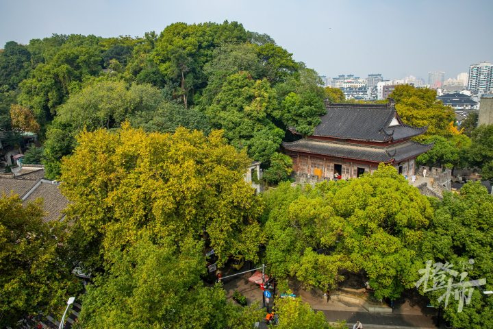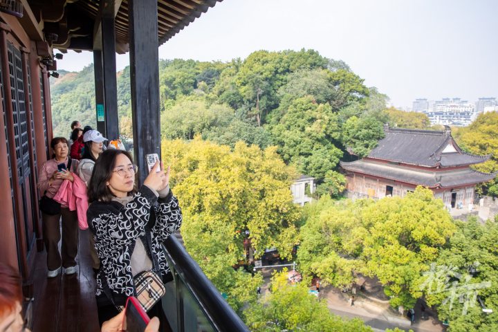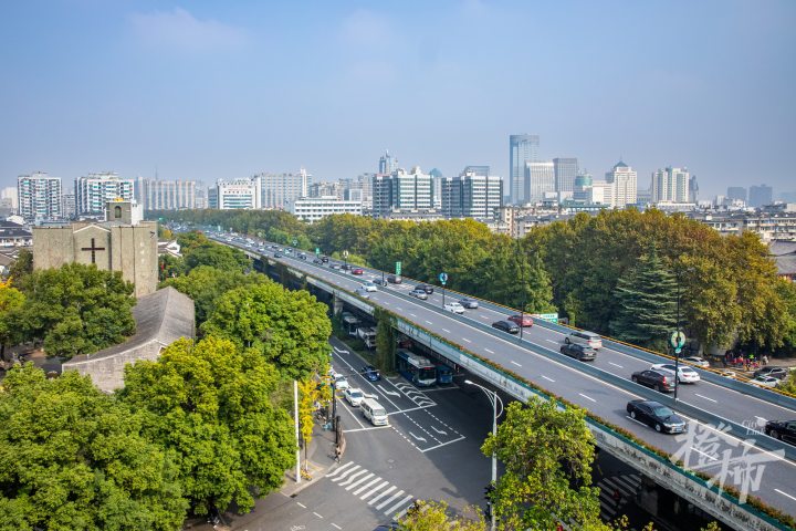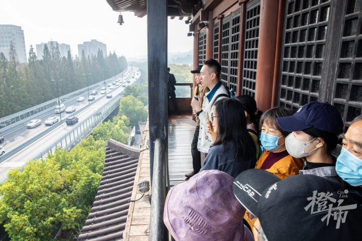 接着又登上鼓楼望仙阁,凭栏远眺,视野开阔,可以看到南宋德寿宫遗址博物馆和车水马龙的中河高架,底下安静的中河就像是一把嵌于杭州中部贯通南北的钥匙,拧动它,“钱塘自古繁华”的密码便缓缓解开。