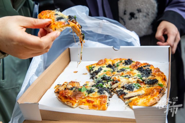十五奎巷里有一家无门头的披萨小店,门面小到一不留神就可能会错过它。这是一家杭州夫妻店,据说老板以前是做西餐的,退休以后在这里开了小店,披萨全部现点现做,每天卖完为止,价格也很亲民。不赶时间的话,还可以坐在居民楼门口的小桌子旁边吃,是一种既接地气又很洋气的奇妙感觉。我们特地点了三个招牌的黑松露比萨,新鲜出炉,分给橙友品尝。