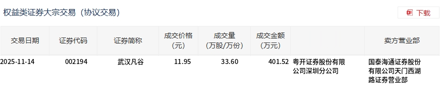 11月14日,武汉凡谷大宗交易成交33.6万股,成交额401.52万元,占当日总成交额的1.26%,成交价11.95元,较市场收盘价13.22元折价9.61%。