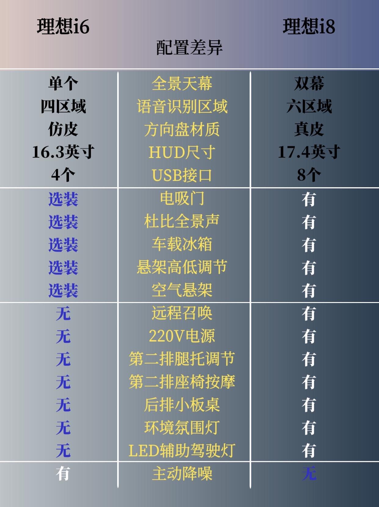 纯电版家族式设计,理想i6和i8差别在哪。从数据来看,理想i8采用双电机系统,而i6则采用单电机和双电机系统。在电池类型上,理想i8搭载三元锂电池,而i6搭载磷酸铁锂电池。在座位布局上,理想i8为6座,i6为5座。除此之外,两者在天窗、语音识别区域、方向盘材质、HUD尺寸等有所不同;同时像电吸门、杜比全景声、车载冰箱、空气悬架等这些配置在i8上是标配,i6则需要选装。总的来说,两款车大体上是相同的,只是部分配置有所区别,就看你如何取舍了。