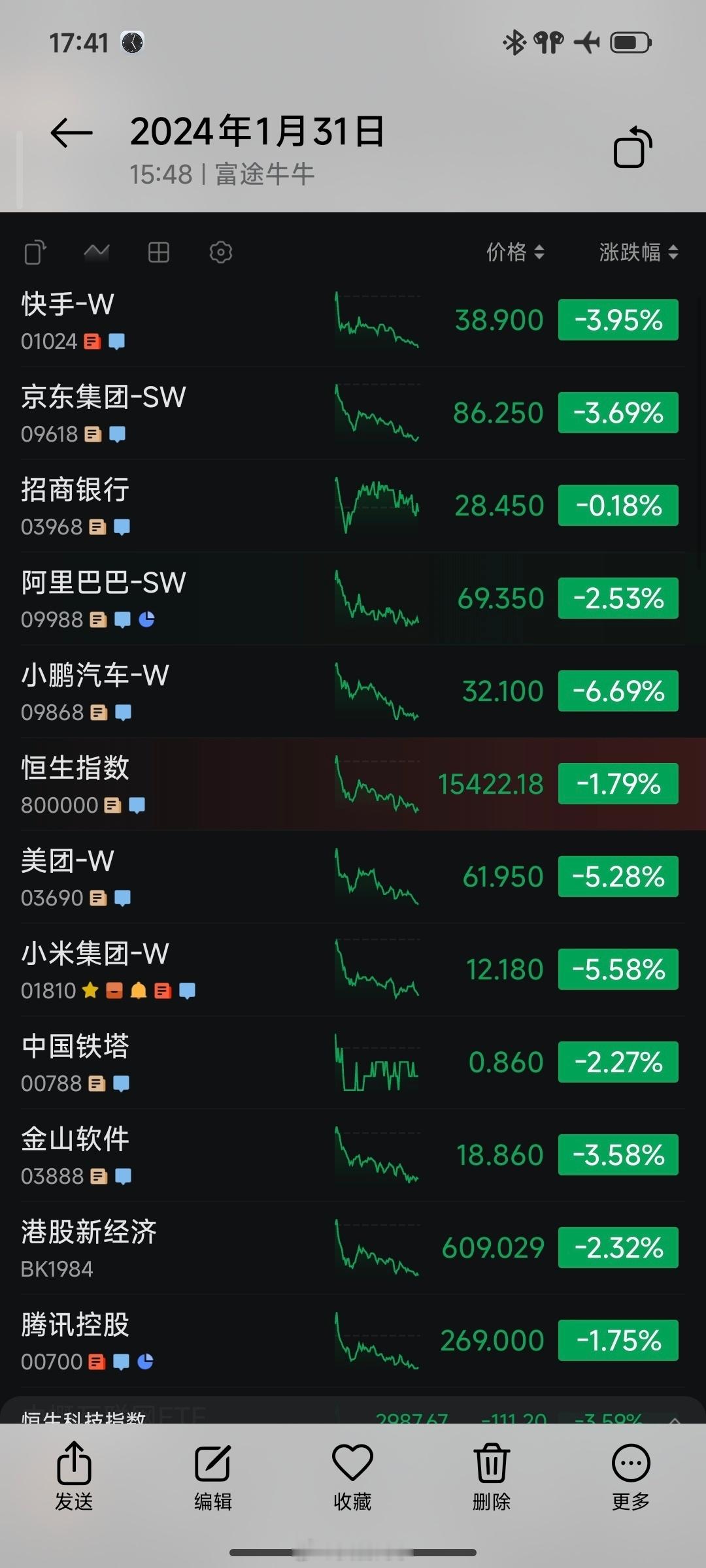 下午的时候在飞机上没事干,整理了一下手机相册,删除一些无用的照片发现一张图,是 2024 年 1 月 31 日截图的,当天股市普遍大回撤,小米股价也大跌 5.58%,当时价格为 12.18 港元现在再回看,云淡风轻