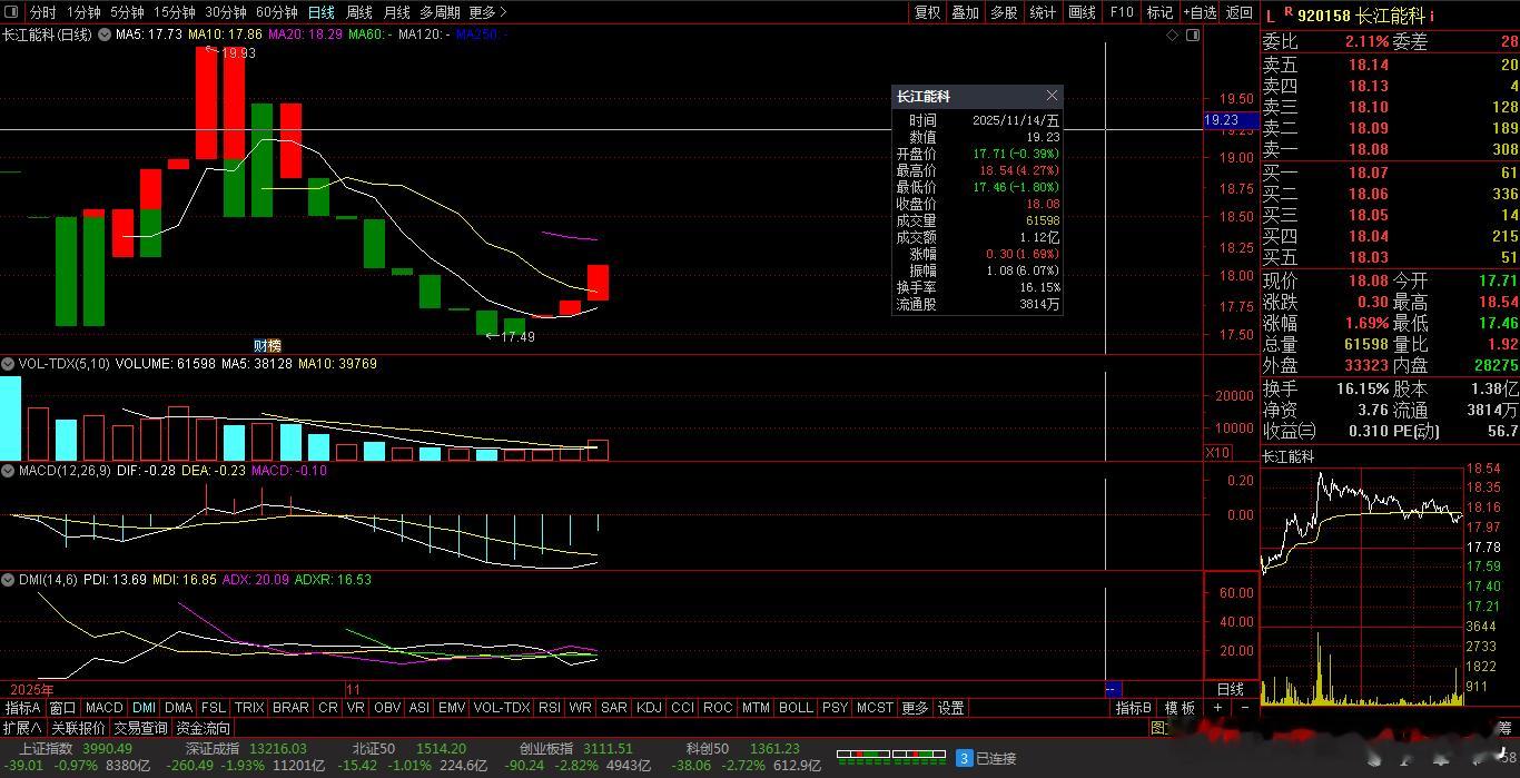 【财富晚茶-今日投资】冰火两重:敢问早盘收红午盘收绿;长江能科:前期双顶筑底震荡突破;沪深北证:厨卫震荡回升游戏杀跌一、冰火两重:恰似“阴盛阳衰”1、早盘收红:午盘收绿第一、2025年11月14日A股上午红盘强势。第二、2025年11月14日A股下午绿盘弱势。2、权重科技:资金博弈第一、主受权重科技分化。第二、市场情绪波动资金。第三、主力博弈兑现影响。3、追梦上午:红盘强势主旋律:利多因素第一、权重筹码带动指数银行、保险等超级权重股走强。推动沪指一度上涨。市场资金集中于权重板块避险 。 第二、板块潮涌筹码活跃大消费、GPU概念等利好消息刺激局部个股上涨,市场情绪短暂回暖 。 4、视野下午:杀跌绿盘主旋律:利空因素第一、科技双创板块重挫科技股重挫:通信设备、半导体等硬科技板块领跌,拖累整体市场 。双创板跌幅超1%。其中之一:科创板跌394家。其中之二:创业板跌856家。第二、数月资金博弈加剧短线资金:获利兑现强力。第三、场外观望场内缩量场外资金:观望情绪浓厚。导致午后:抛压筹码增大;致命一击:成交量未放大 。 第四、失守短线五日均线技术面压力:沪指失守5日均线。20日均线:支撑面临考验。市场搏击:4000点整:数关口的夯实信心不足 。 5、短期风险:技术指标第一、短期风险逢高限售短期风险:日新月异加剧。逢高限售:股潮涌一泻千里。第二、技术指标阶段高位技术指标:市场犹豫明显。若科创50:无法快速收复20日均线,可能引发大盘进一步回调 。 6、后续关注:释放能量第一、量能变化交额萎缩量能变化:午后成交额萎缩至5241亿元。第二、是否量能重现增长沪指为例:若无法放量:4000点支撑或面临挑战 。 第三、存储芯片重燃焦点硬科技表现:存储芯片等板块或成午后关注焦点,但整体市场仍需权重股与成长股的协同 。 二、视野焦点:恰似“火眼金睛”920158 长江能科 盘中 04涨1、震荡突破:一年箱底视野盘面:前期双顶:震荡突破:2025-11-14 截至1500:股价报收:18.08元。股指上涨:1.69%。成交总量:61598手,成交金额:1.12亿元。总换手率16.15%,观总市值:24.96亿元。流通市值:6.90亿元。2、能化设备:行业翘楚品牌经营:能源化工专用设备研产和销售。公司品牌:电脱设备市场占有率居国内第一。3、营收净利:可圈可点业绩好转:2025-09-30 半年度报:公司营收:2.0866亿 同比增5.15%。公司净利:3304.1149万 同比增3.75%。