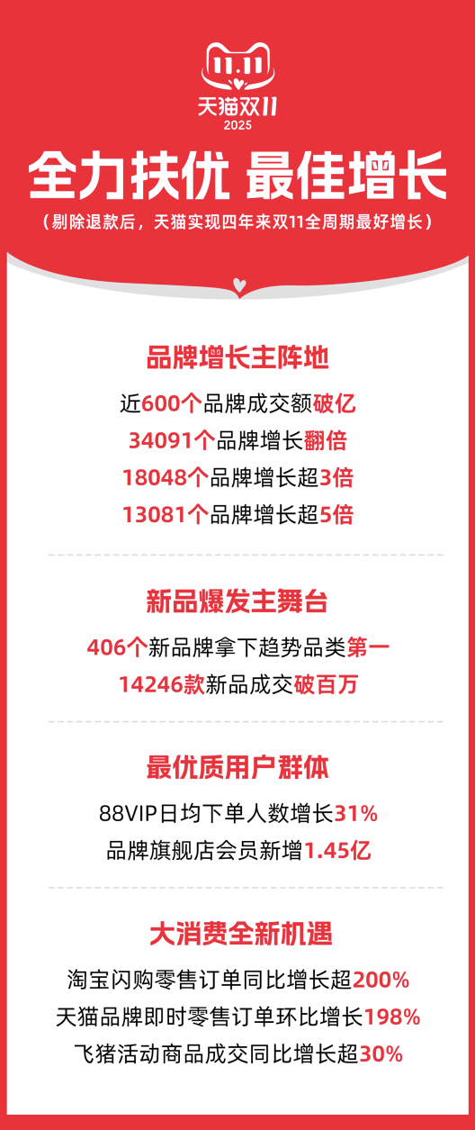今年以来,天猫提出全力扶持优质品牌和原创商家,投入战略级资源做大品牌增长。2025年天猫双11,天猫实现了四年来双11全周期最好的一次增长。天猫始终是优质品牌商家的增长主阵地,天猫双11始终是优质品牌商家全年最重要的增长机会。