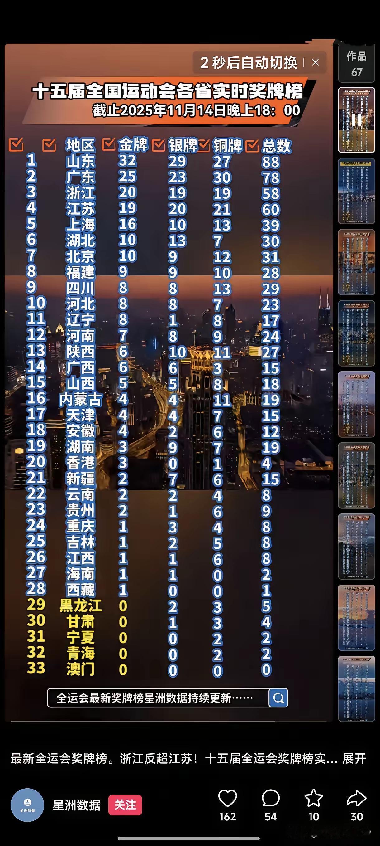 友谊第一,比赛第二 十五届全运会最新金牌榜