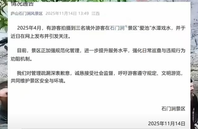 2025年4月,有游客拍摄到三名境外游客在石门涧景区“爱池”水潭戏水,并于近日在网上发布并引发关注。