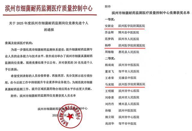 近日,滨州市临床检验领域两项重要赛事相继揭晓结果。在2025年度滨州市临床检验技能竞赛中,滨州医学院附属医院检验团队获得团体一等奖;检验科司秀文、孙阵阵、曹琳获得个人二等奖。在滨州市细菌真菌耐药监测岗位竞赛中,检验科安新业、杨晔获得个人一等奖,马寅舰获得个人二等奖。