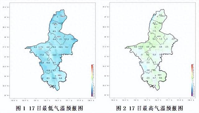 受冷空气影响,16日至17日全区气温持续下降,17日较15日最低气温下降6℃~10℃,最高气温下降10℃~16℃,17日最低气温降至-12℃~-8℃,最高气温降至-6℃~-1℃。