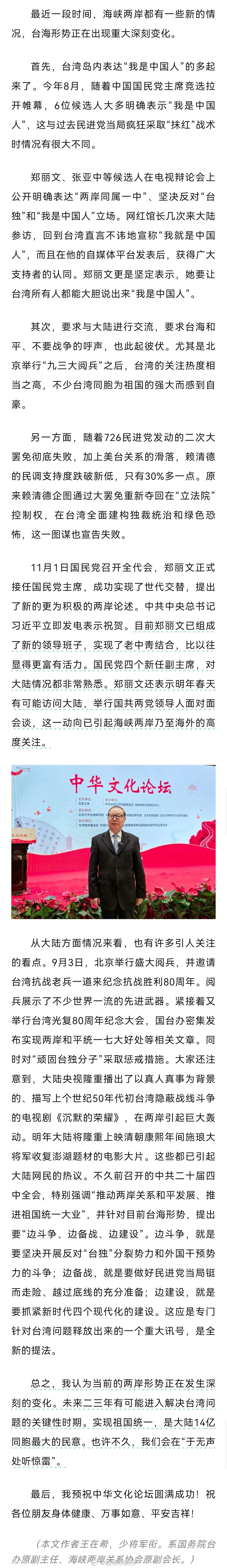 王在希先生在这个讲话中提到,未来二三年有可能进入解决台湾问题的关键性时期。实现祖国统一,是大陆14亿同胞最大的民意。也许不久,我们会在“于无声处听惊雷”。