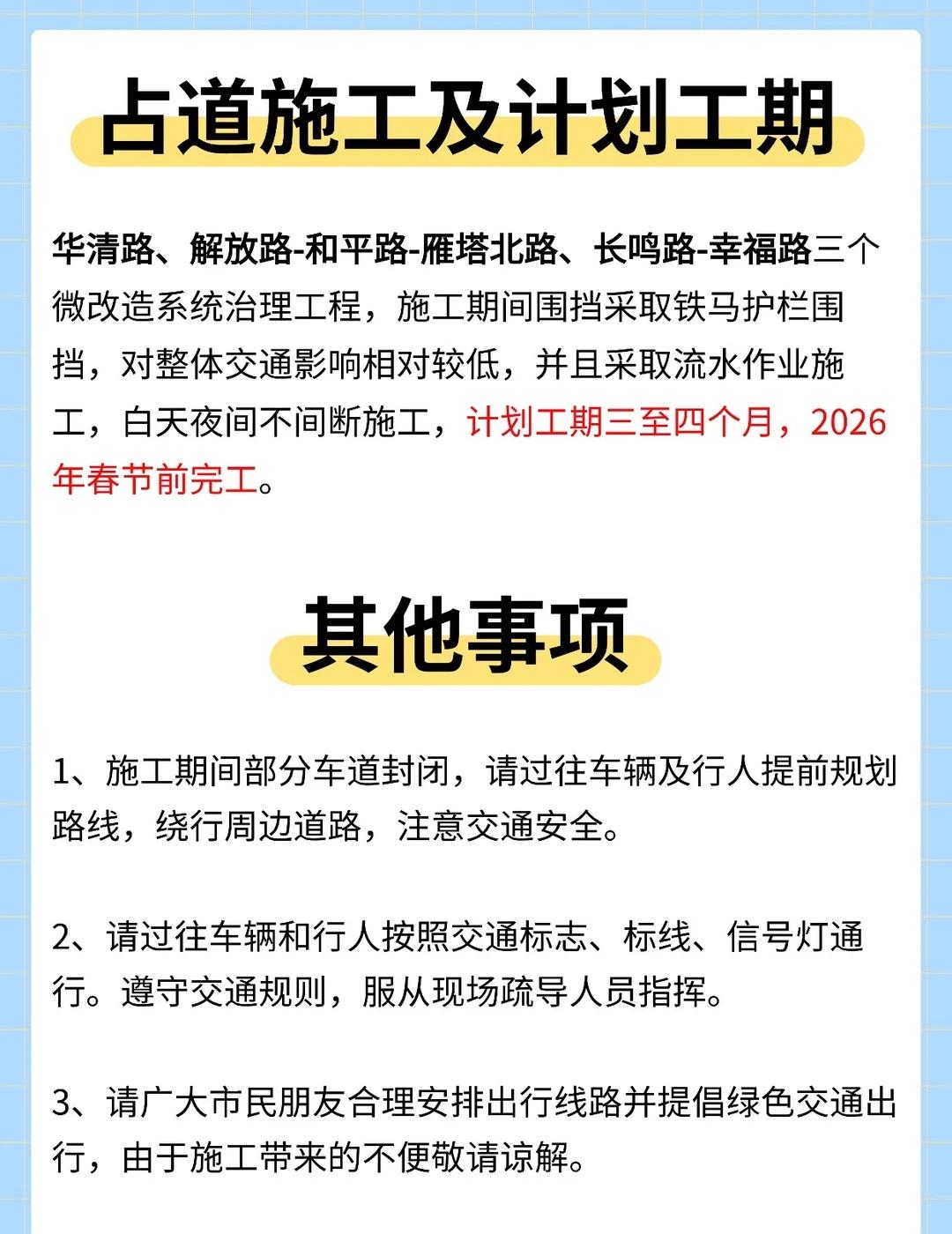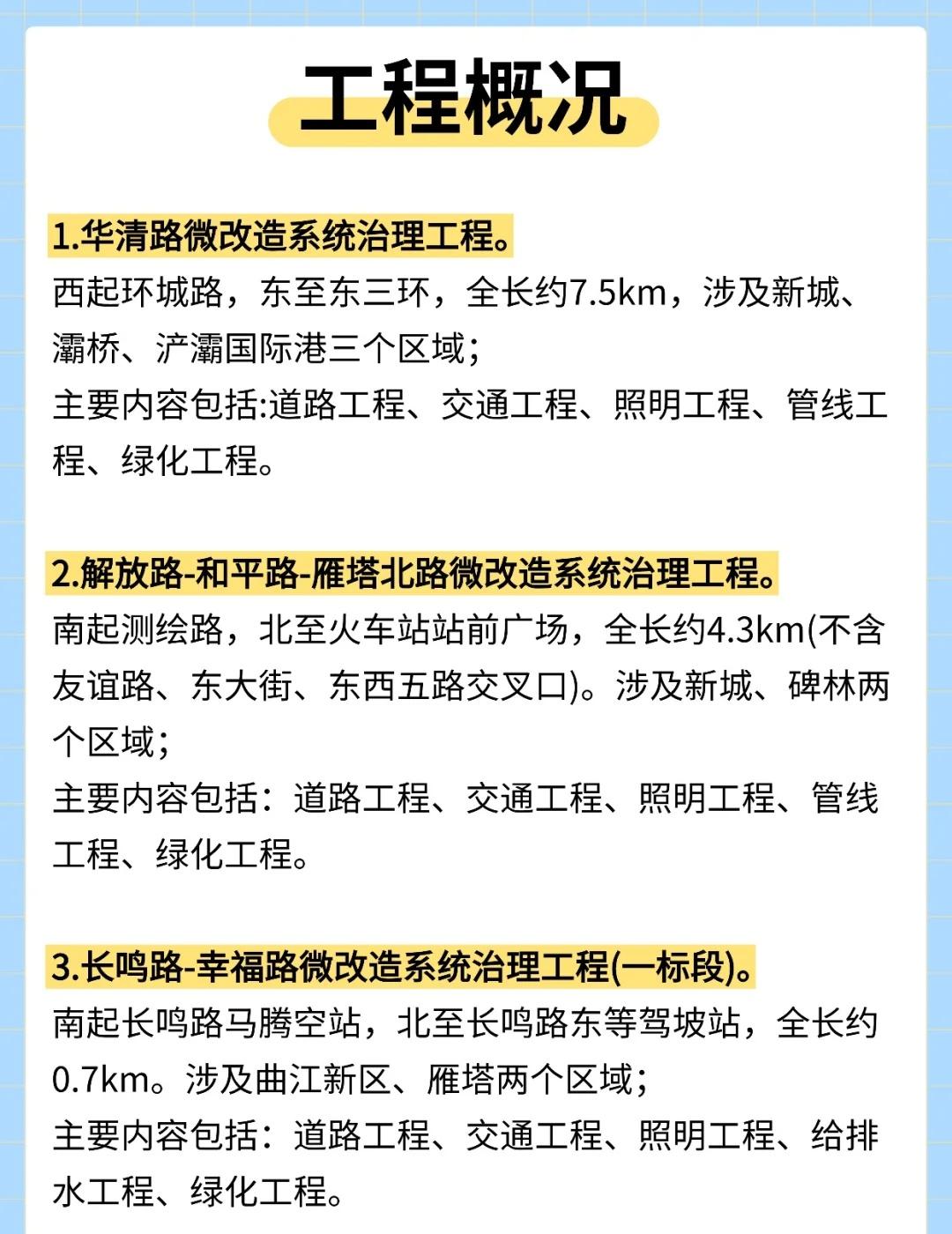 西安3条道路将启动改造!预计26春节前完工 📢西安街坊注意啦 📍华清路、解放路-和平路-雁塔北路、长鸣路-幸福路三个微改造系统治理工程即将围挡建设。 🚶‍♂️现就施工期间具体交通导行情况预公告如下: - 🚗工程概况 [一]华清路微改造系统治理工程 🔸西起环城路,东至东三环,全长约7.5km,涉及新城、灞桥、浐灞国际港三个区域; 🔸主要内容包括:道路工程、交通工程、照明工程、管线工程、绿化工程。 [二]解放路-和平路-雁塔北路微改造系统治理工程 🔸南起测绘路,北至火车站站前广场,全长约4.3km(不含友谊路、东大街、东西五路交叉口)。涉及新城、碑林两个区域; 🔸主要内容包括:道路工程、交通工程、照明工程、管线工程、绿化工程。 [三]长鸣路-幸福路微改造系统治理工程(一标段) 🔸南起长鸣路马腾空站,北至长鸣路东等驾坡站,全长约 0.7km。涉及曲江新区、雁塔两个区域; 🔸主要内容包括:道路工程、交通工程、照明工程、给排水工程、绿化工程。 - 🚧占道施工及计划工期 🔺华清路、解放路-和平路-雁塔北路、长鸣路-幸福路三个微改造系统治理工程,施工期间围挡采取铁马护栏围挡,对整体交通影响相对较低,并且采取流水作业施工,白天夜间不间断施工。 🔺计划工期三至四个月,2026年春节前完工。 - 📣其他事项 🔹施工期间部分车道封闭,请过往车辆及行人提前规划路线,绕行周边道路,注意交通安全。 🔹请过往车辆和行人按照交通标志、标线、信号灯通行。遵守交通规则,服从现场疏导人员指挥。 🔹请广大市民朋友合理安排出行线路并提倡绿色交通出行,由于施工带来的不便敬请谅解。 - 西安施工 城市规划建设 城市更新改造华清路 雁塔北路 和平路 解放路 长鸣路