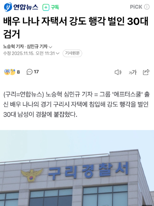 据韩媒,11月15日,韩国一名30多岁男子闯入组合AfterSchool出身的演员@NANA_林珍娜位于韩国京畿道九里市住宅并实施抢劫。