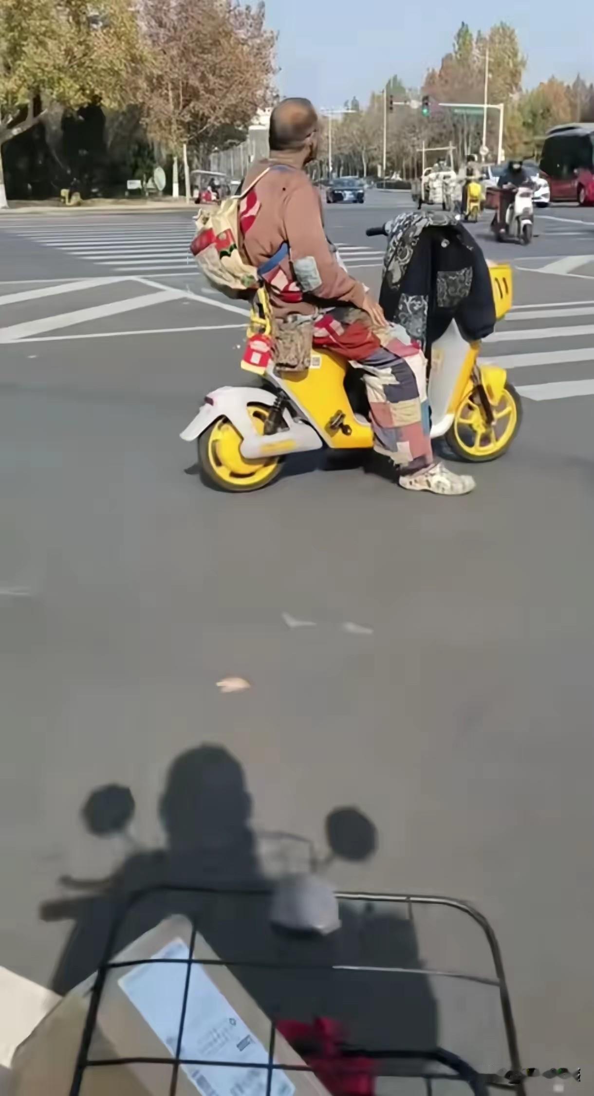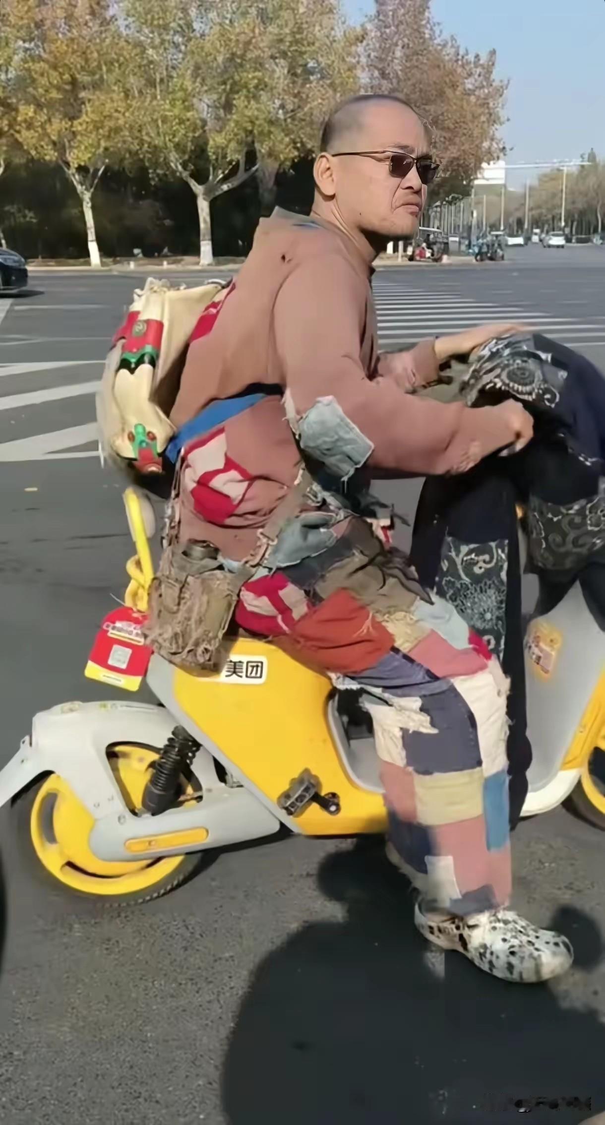 画面中这个骑摩托车的人,穿的衣服虽然全是补丁,不明白咋回事的,还以为是个要饭花子,但据明白人说,说他穿的这身衣服是非常名贵的,一般的人还真穿不起,现在真是有些搞不懂了,原来有些人穿衣服也是返璞归真啦,以此来突出自己鲜明的个性!
