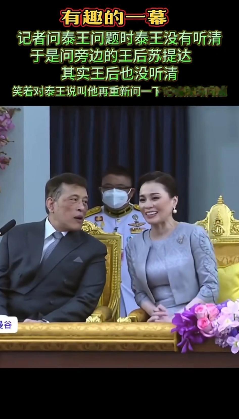 “有趣的一幕” 记记者问泰王问题是时,泰王没有听清楚,于是泰王转头问旁边的王后苏